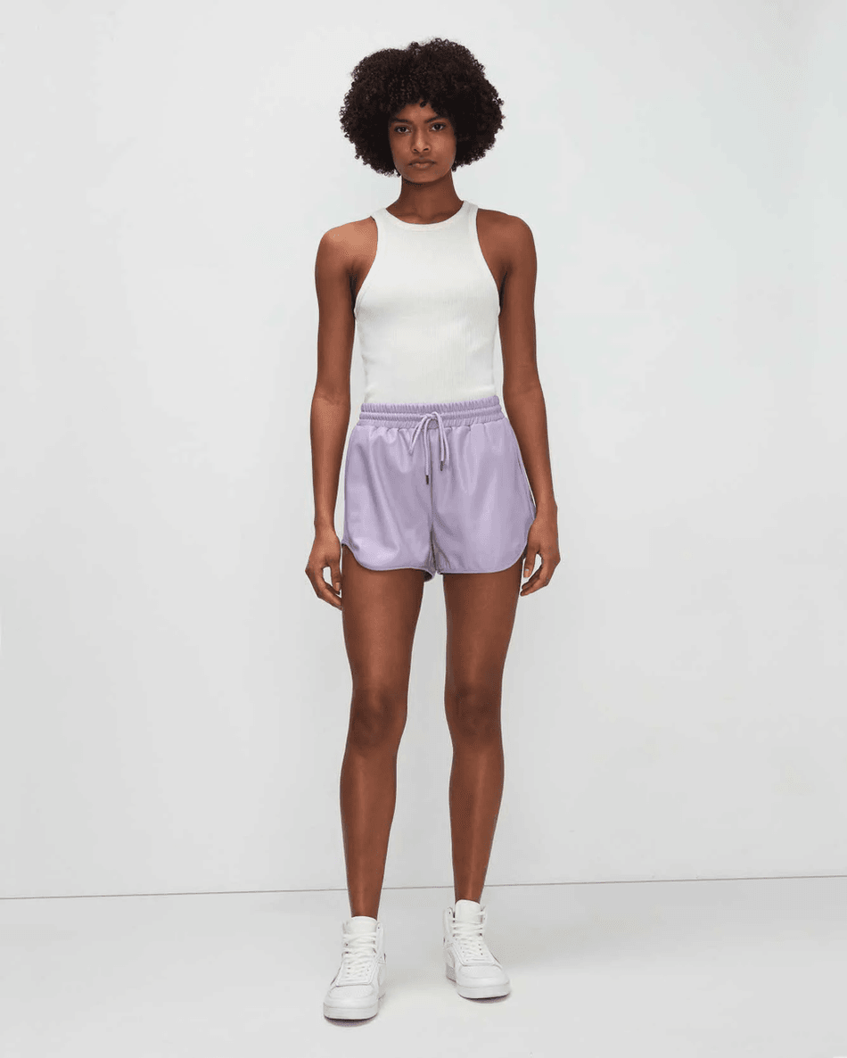 Discover the 7 For All Mankind Faux Leather Dolphin Shorts in Light Lavender