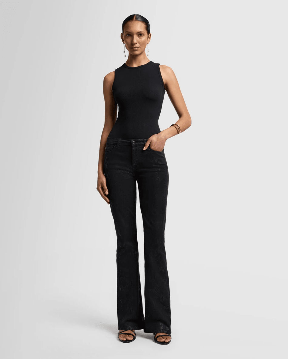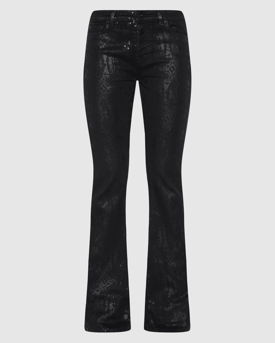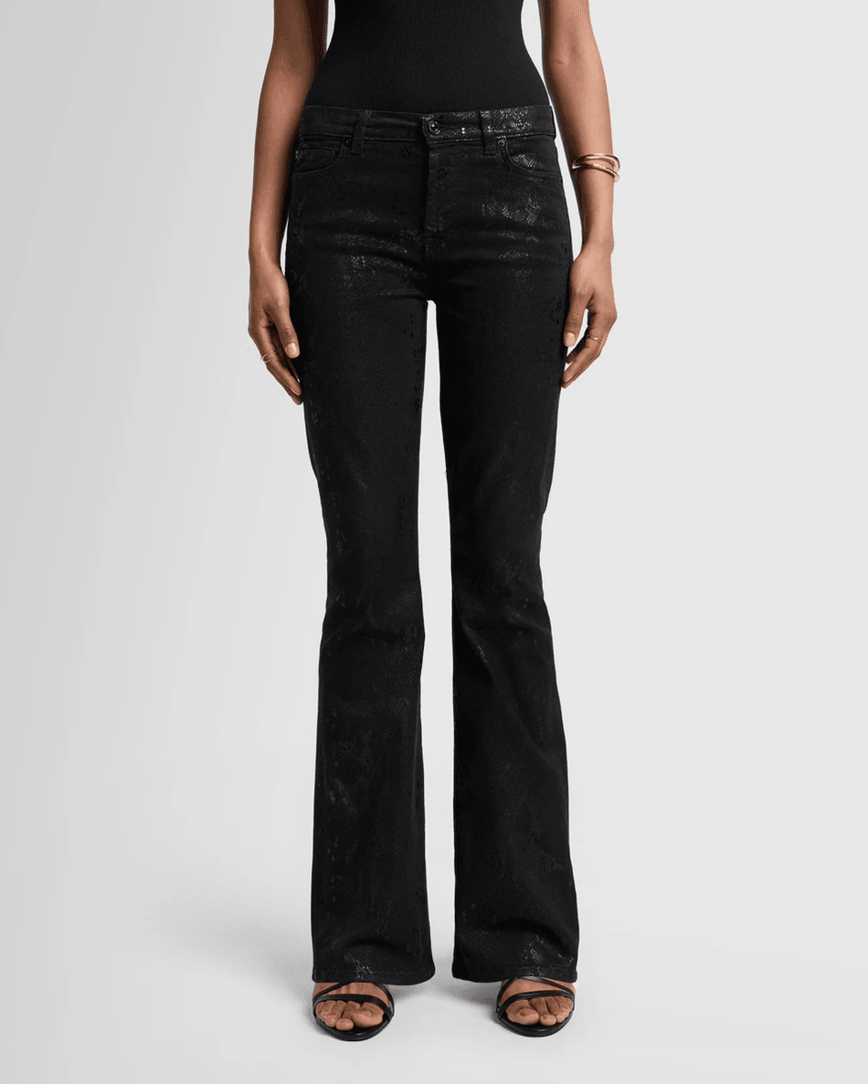 Elevate your style with the 7 For All Mankind High Waist Ali in Black Cobra. This stunning denim combines a chic high rise with a fierce snake-skin print, giving you the perfect blend of comfort and trend. Experience a fit that hugs your hips and thighs before flaring out dramatically from the knee.