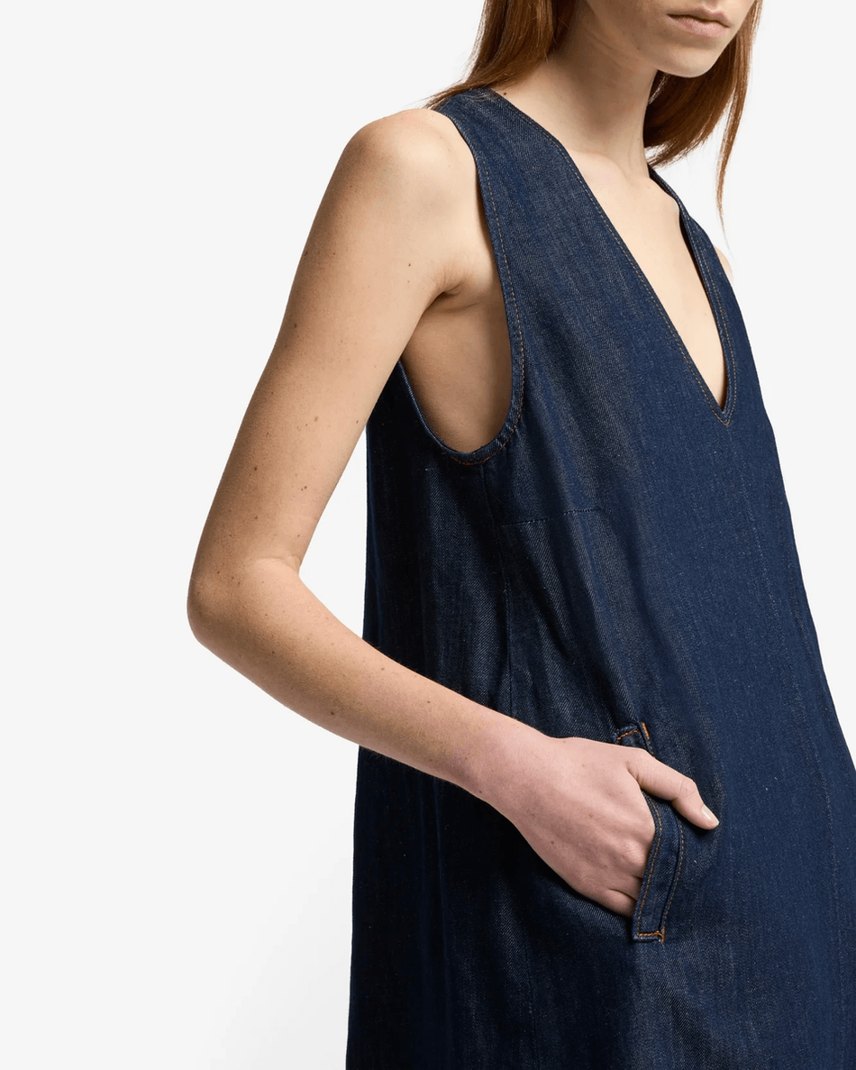 Discover the 7 For All Mankind Indigo Linen V-Neck Dress in Blueberry Blueberry
