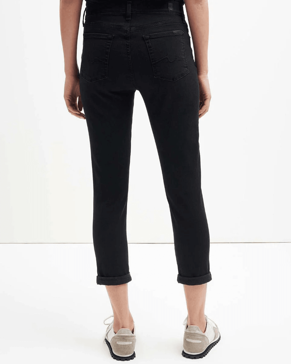 Elevate your denim game with the 7 For All Mankind Josefina In Nice Ash. This stylish pair features a slimmed-down boyfriend silhouette in a rich, dark hue, perfect for any casual occasion.