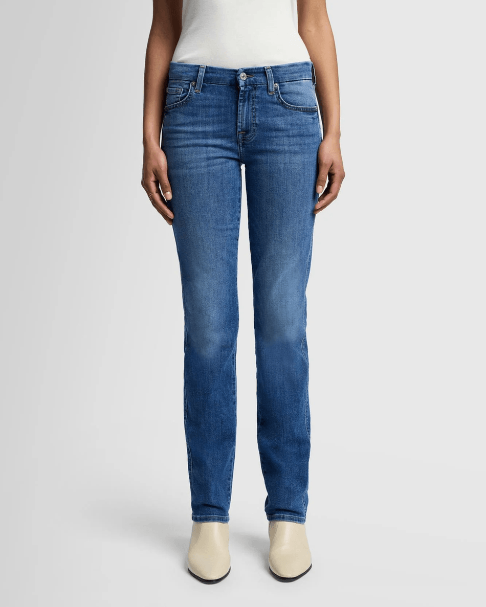 Elevate your denim collection with the 7 For All Mankind Kimmie Straight in Marsh Marsh. This mid-rise straight fit jean is designed for those who appreciate a slim silhouette without sacrificing comfort. With a full-length leg, these jeans are perfect for any occasion, from casual outings to stylish events.