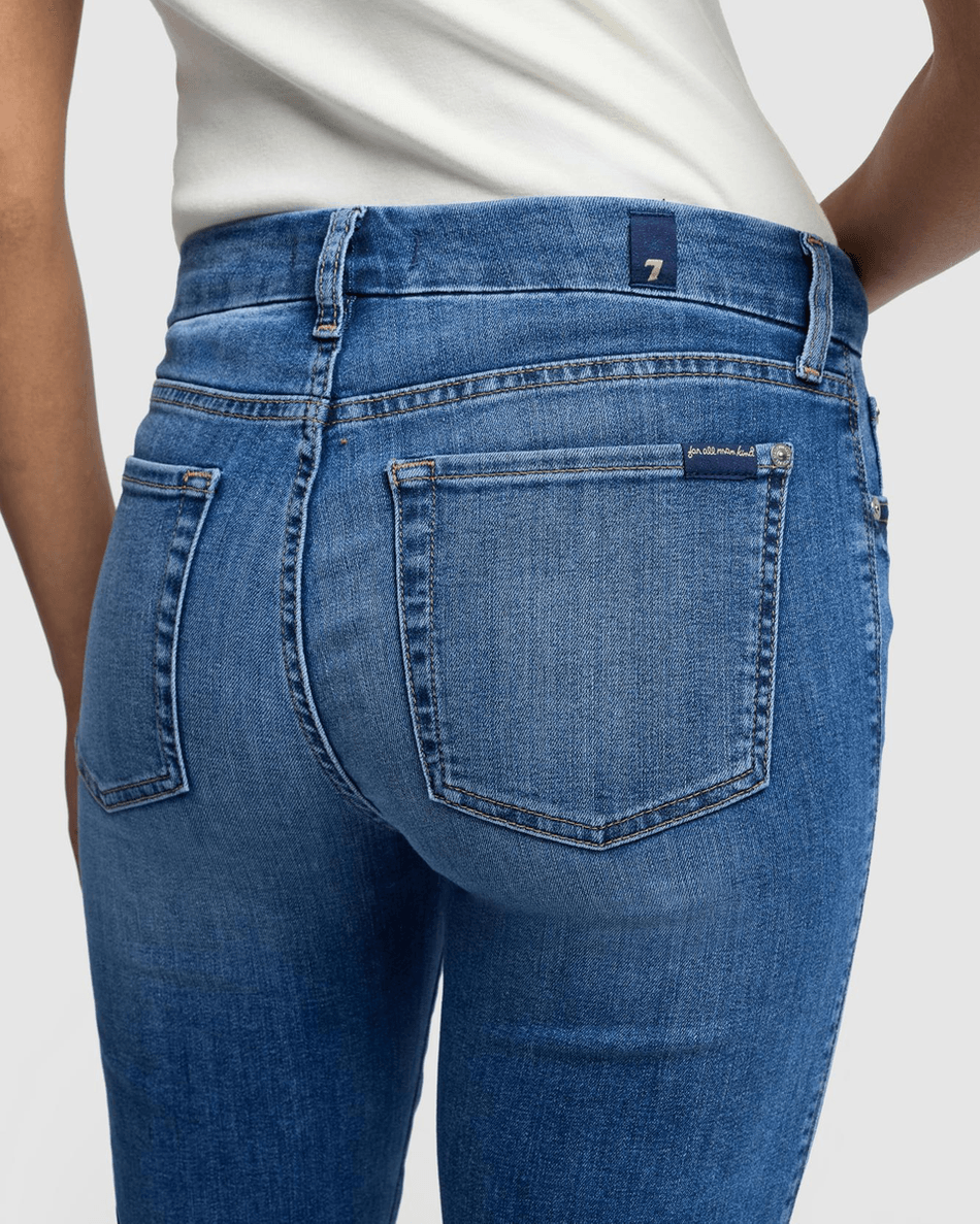 The 7 For All Mankind Kimmie Straight in Marsh Marsh features a beautifully crafted medium blue wash that pairs well with any top. The subtle whiskering and sanding along the thighs add a touch of character to your look. Crafted to provide a classic denim feel, these jeans offer just the right amount of stretch to move with you, ensuring maximum comfort throughout your day.