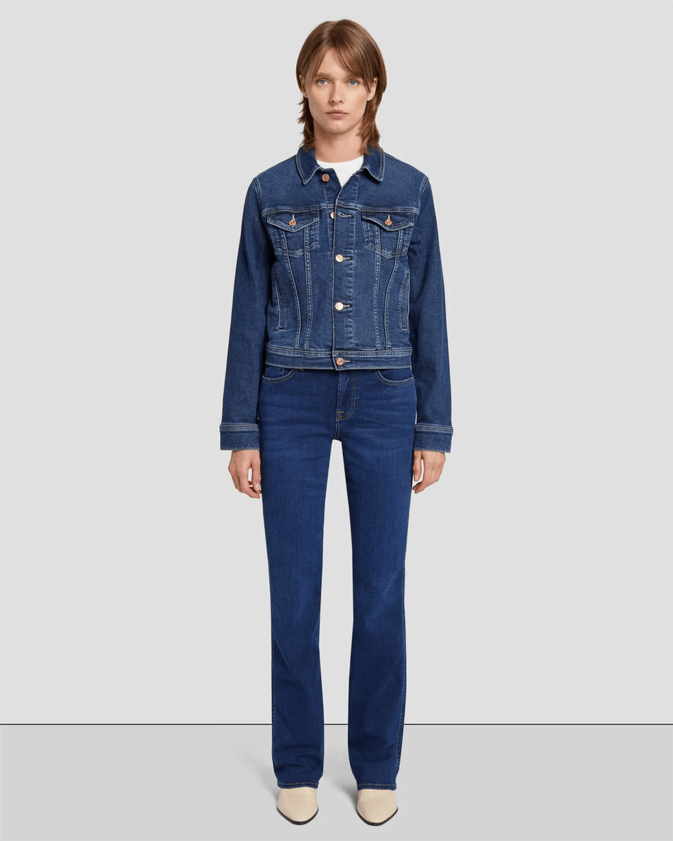 The 7 For All Mankind Luxe Vintage Classic Trucker Jacket in Deep Soul is not just a jacket; it's an essential addition to your wardrobe. With its classic silhouette and luxe denim, this jacket transitions effortlessly from day to night. Pair it with your favorite jeans or dress it up with a skirt for a chic ensemble.