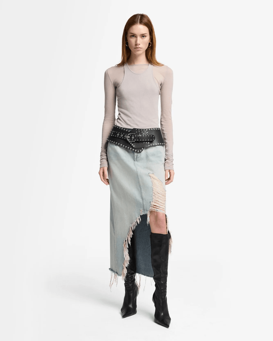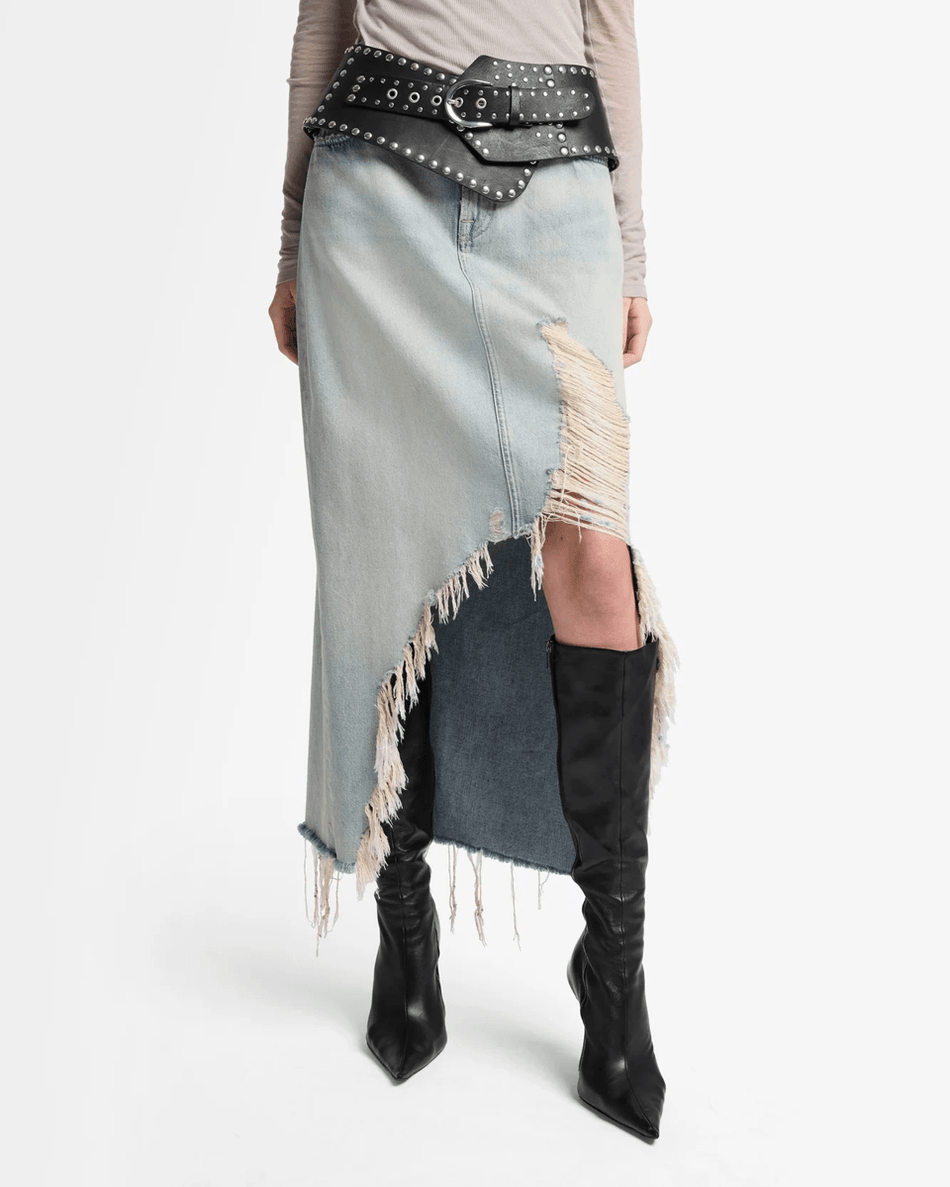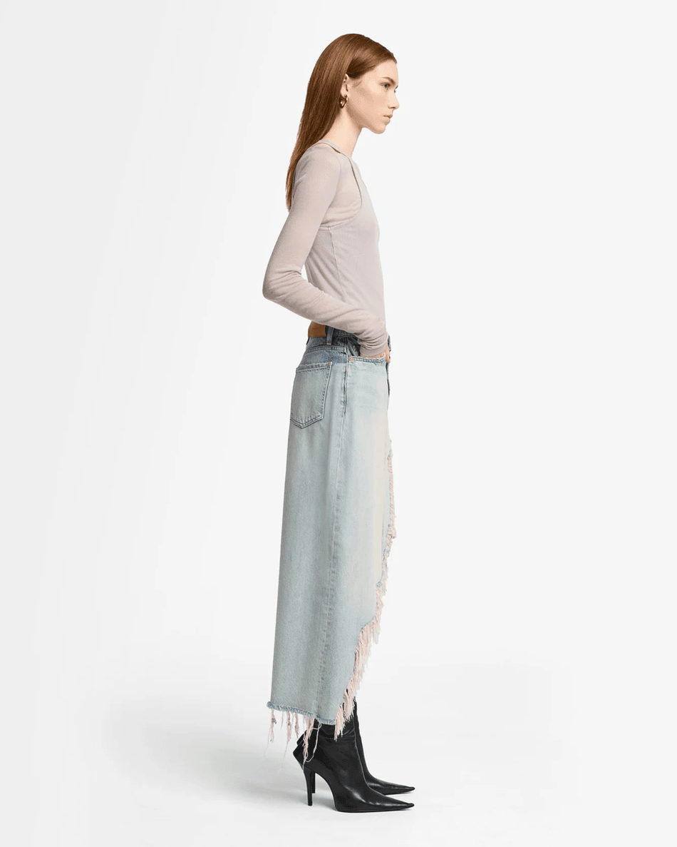 Elevate your wardrobe with the 7 For All Mankind MANKIND Denim Midi Skirt in Peaches Peaches. This stunning mid-length skirt combines a structured fit with a chic asymmetrical design, making it the perfect choice for any fashion-forward individual.