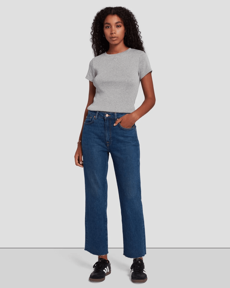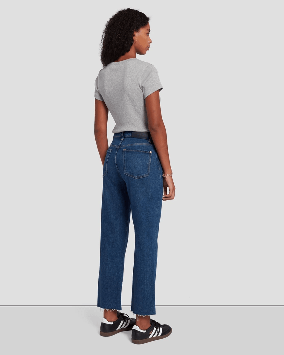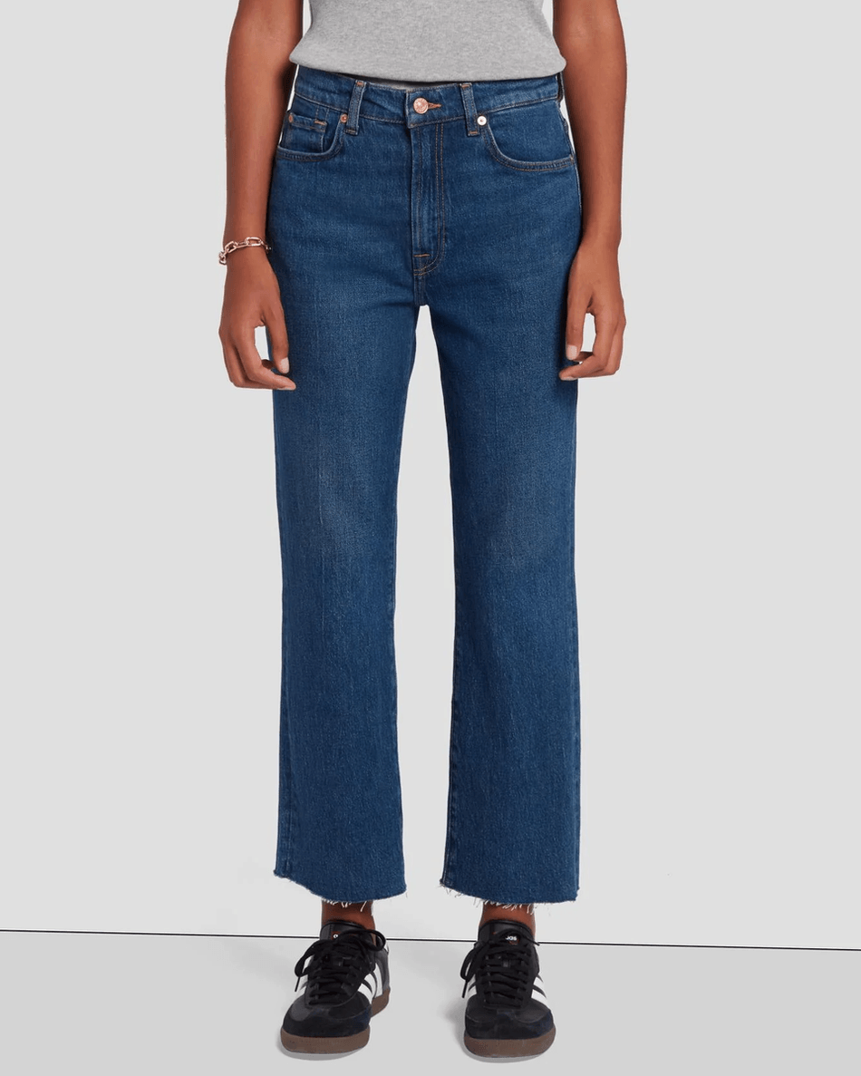 Elevate your denim collection with the 7 For All Mankind MANKIND Logan Stovepipe in Bluebell. This stylish piece from our edgy Mankind collection showcases a modern silhouette that combines comfort and fashion effortlessly. With its cropped stovepipe design and vibrant medium blue wash, this jean is a must-have for any wardrobe.
