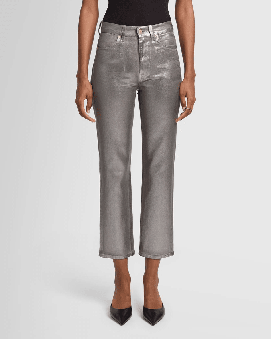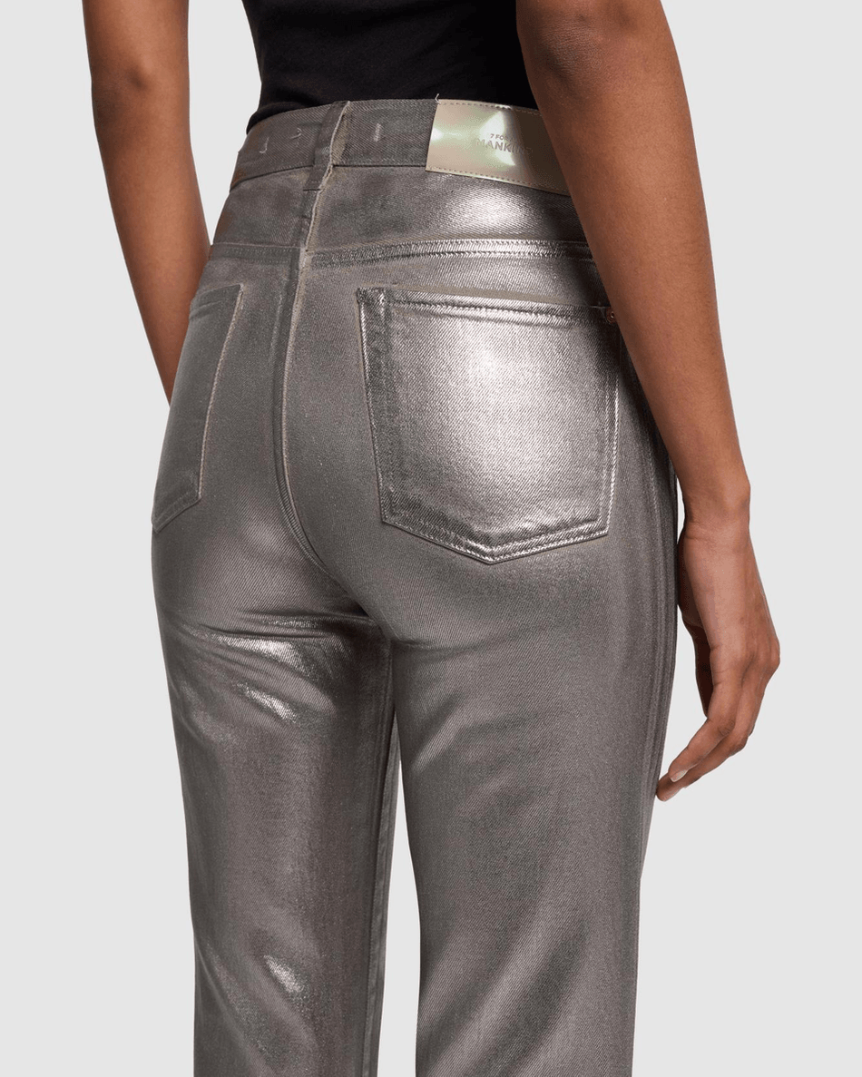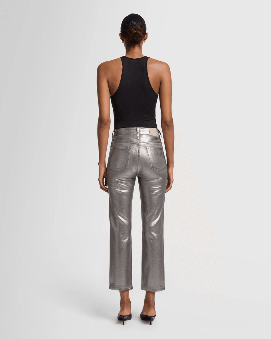 Discover the perfect blend of comfort and style with the 7 For All Mankind MANKIND Logan Stovepipe in Coated Champagne. This high-rise cropped straight leg denim offers a sophisticated look that easily transitions from day to night. Featuring a luxurious metallic silver wash, these jeans are designed to make a statement.