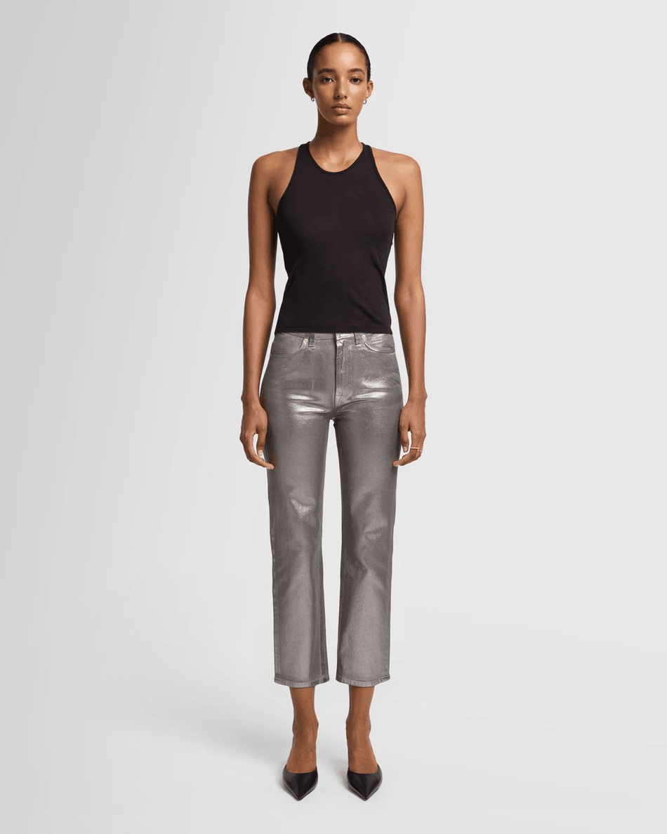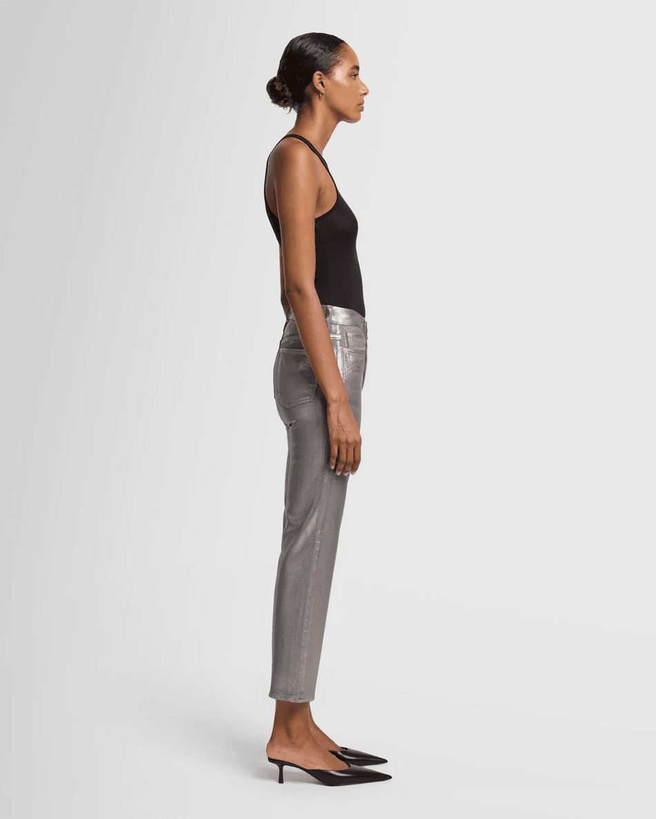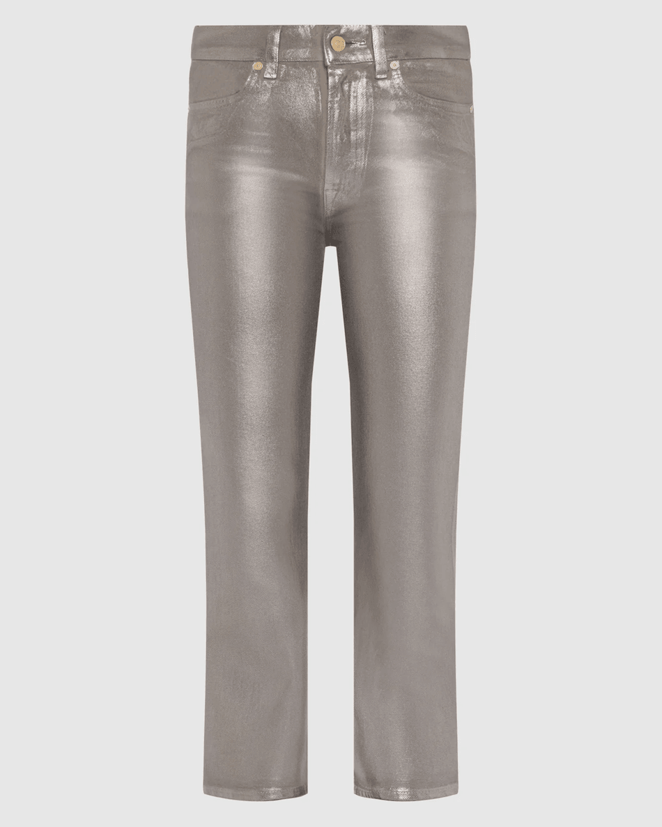 Discover the perfect blend of comfort and style with the 7 For All Mankind MANKIND Logan Stovepipe in Coated Champagne. This high-rise cropped straight leg denim offers a sophisticated look that easily transitions from day to night. Featuring a luxurious metallic silver wash, these jeans are designed to make a statement.