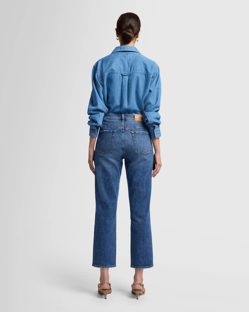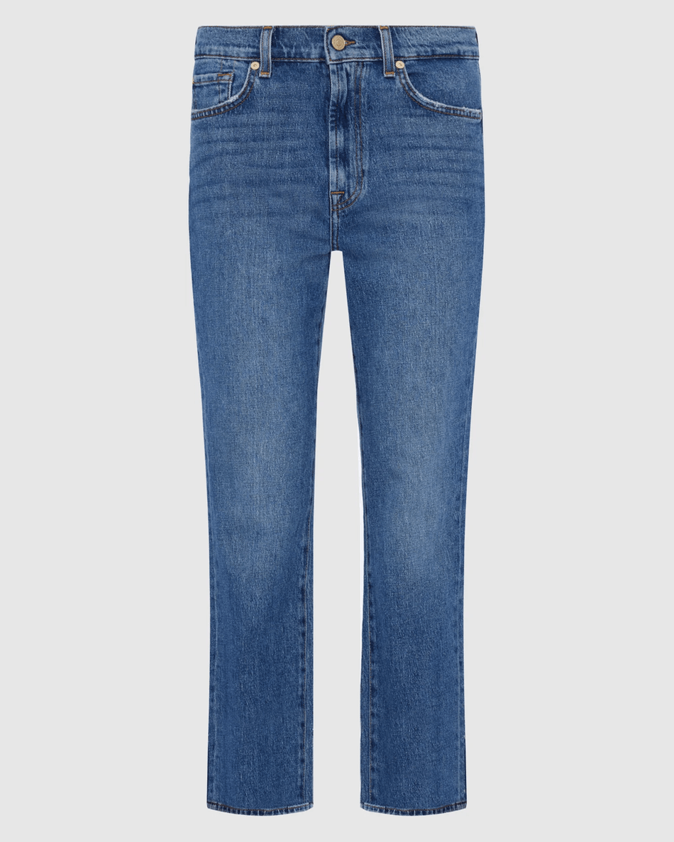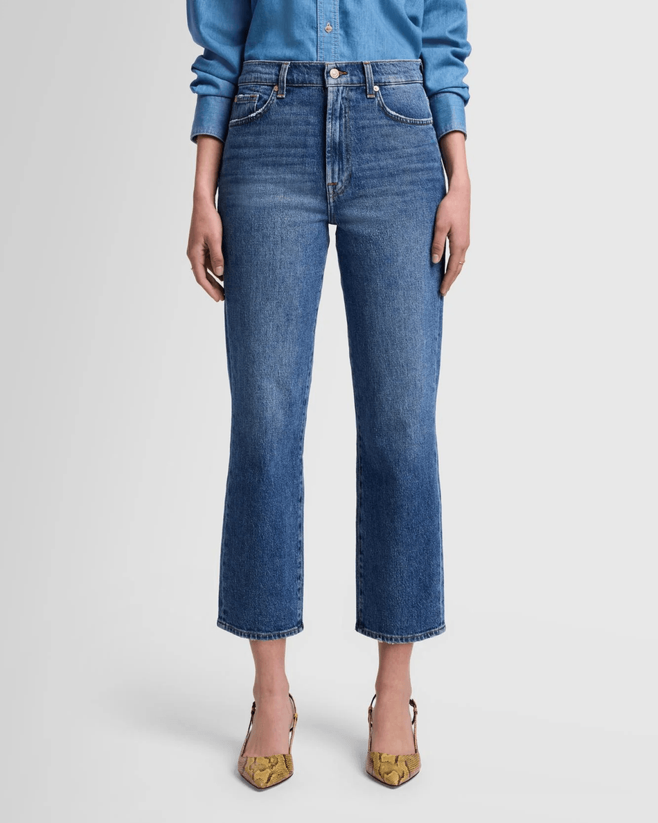 Elevate your denim game with the 7 For All Mankind MANKIND Logan Stovepipe in Santa Cruz. Designed for those who appreciate classic style, this high-rise cropped straight leg jean combines timeless fashion with modern comfort. Experience the essence of quality denim that improves with every wear.
