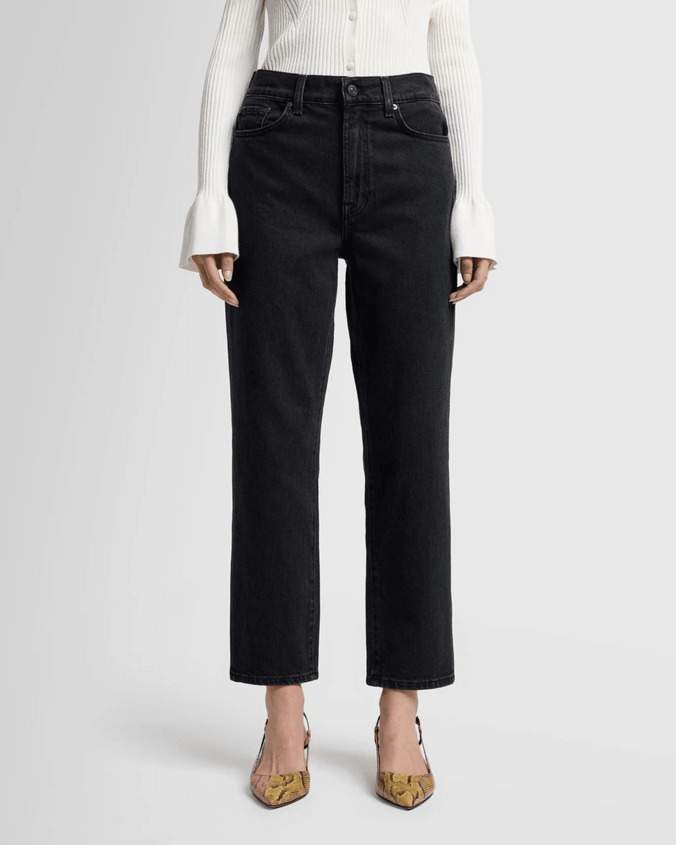 Elevate your denim game with the 7 For All Mankind MANKIND Logan Stovepipe in Thunder Thunder. Designed for those who appreciate style and comfort, this high-rise cropped straight leg jean perfectly balances classic looks with modern appeal.