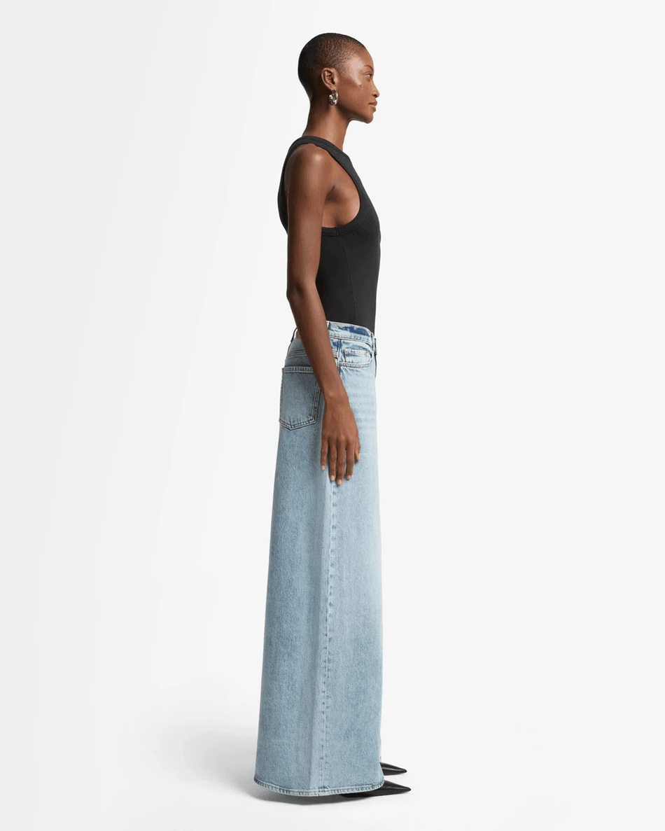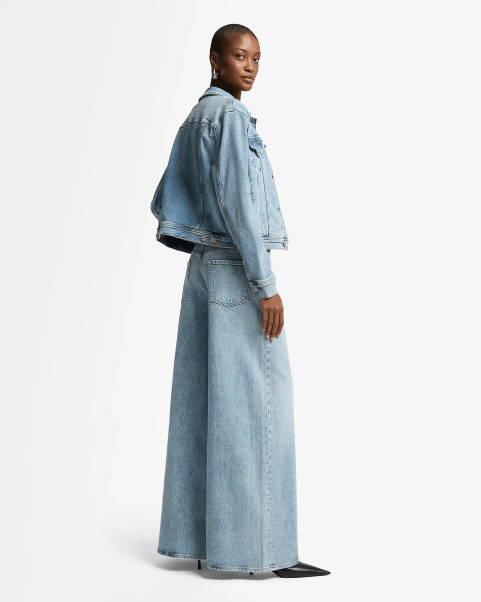 The 7 For All Mankind MANKIND Marie Wide Leg in Ode To is crafted from high-quality, rigid denim that maintains its structure while adapting to your unique shape. This jean features a light indigo wash, complemented by subtle whiskering and sanding along the hips and legs, giving it a modern, lived-in vibe. The clean back pocket design adds a touch of sophistication, making it versatile for any occasion.