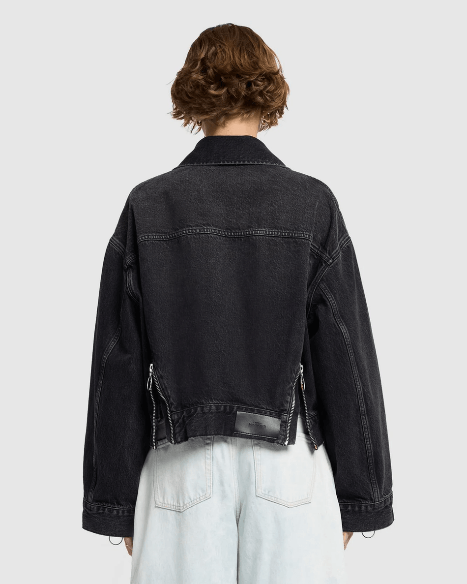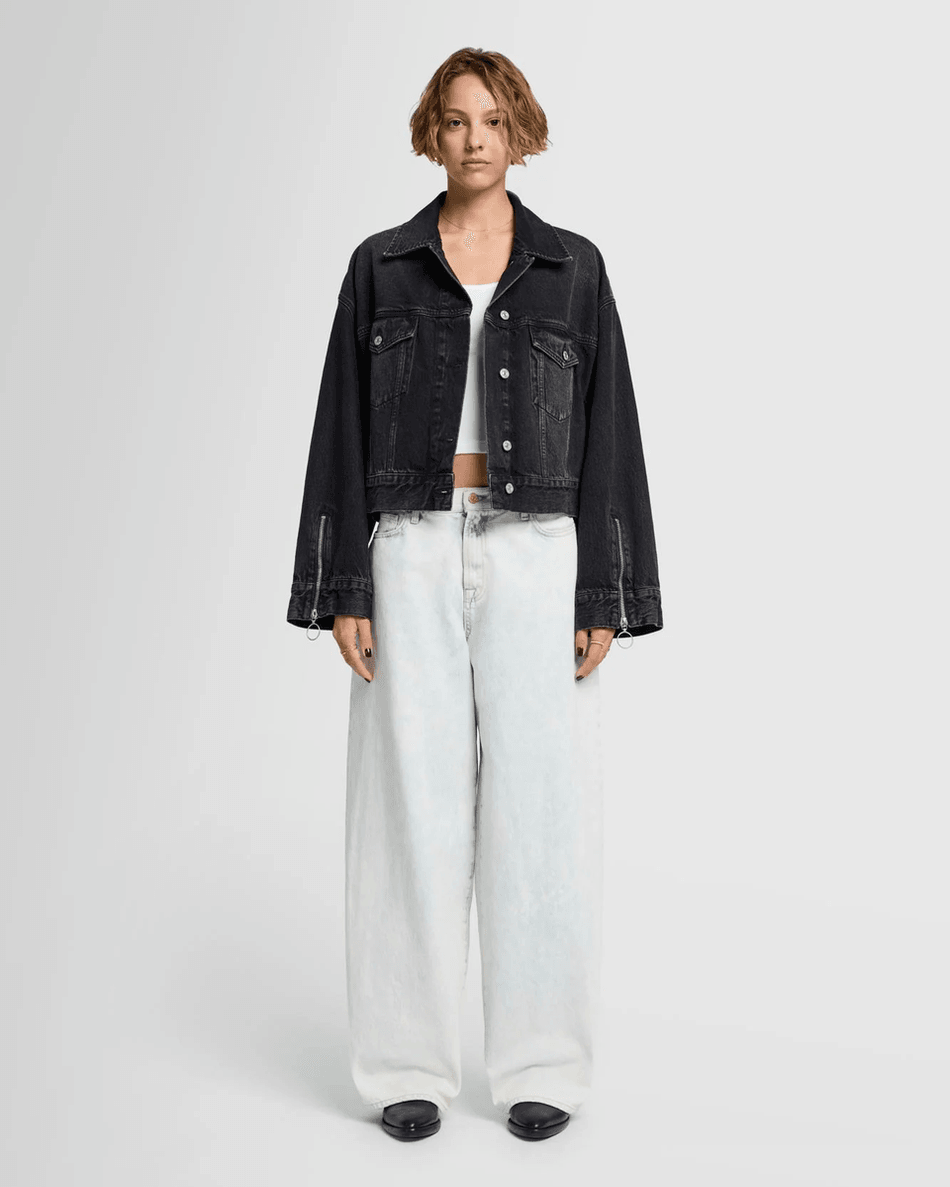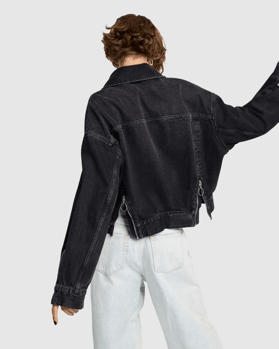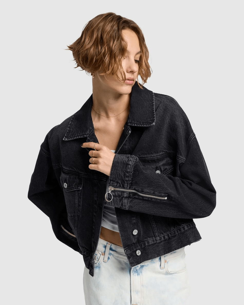 With its washed black finish and distinctive features, this cropped trucker jacket is perfect for transitioning between seasons. Whether you’re heading out for brunch or a night out on the town, it’s the ideal piece to complete your look.