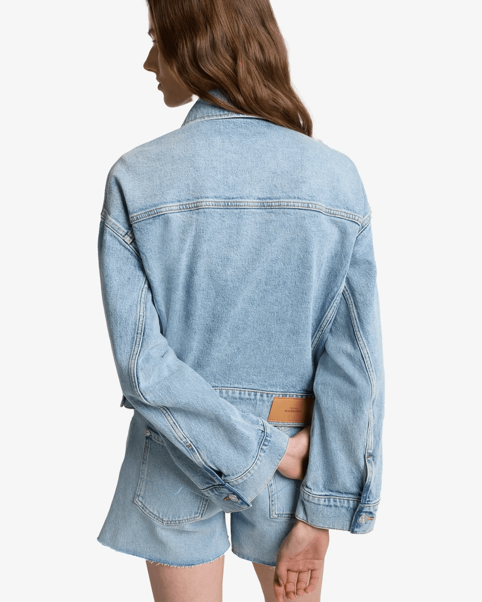 The 7 For All Mankind MANKIND Oli Cropped Trucker Jacket is crafted from durable rigid denim, ensuring it retains its shape while providing a comfortable, lived-in feel as you wear it. The timeless light indigo wash and button-flap patch pockets add a touch of vintage charm, making it a versatile piece for any occasion.