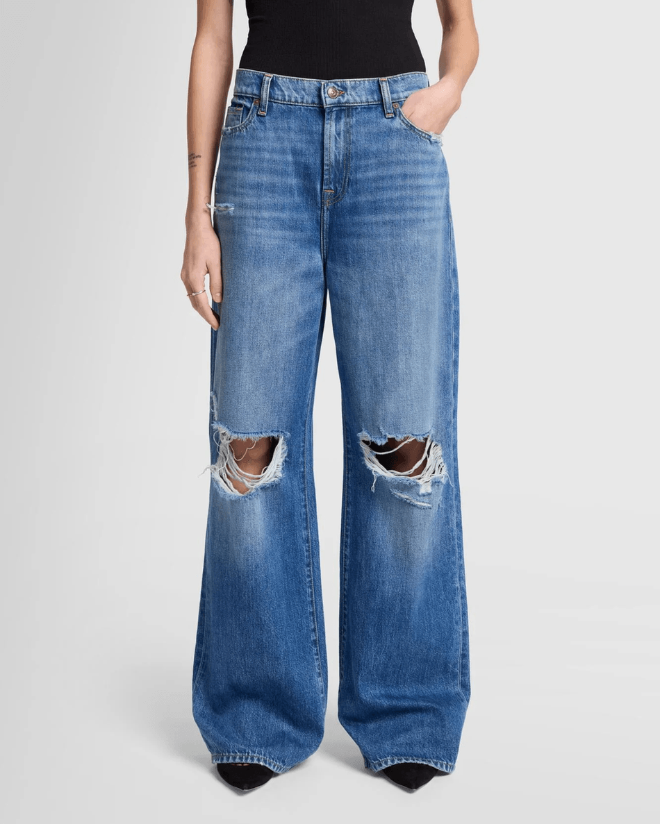 The 7 For All Mankind Scout Oversized Straight in Dasher Dasher is crafted for those who want to make a statement while enjoying all-day comfort. With its oversized straight leg, this denim effortlessly combines style and ease. The chic blue wash, complete with trendy knee rips and light sanding, adds a fresh twist to a classic silhouette.