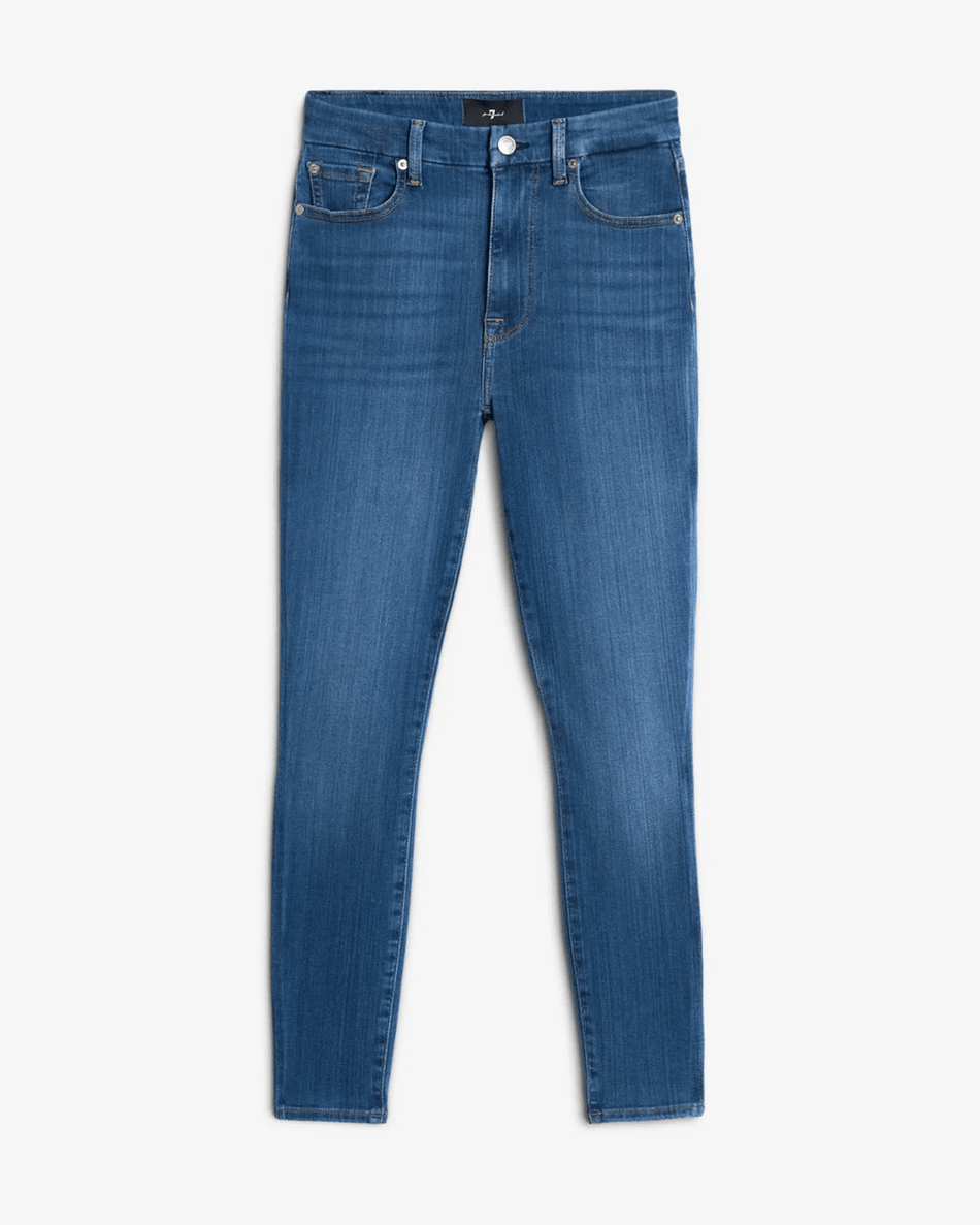 Step into style and comfort with the 7 For All Mankind Slim Illusion High Waist Ankle Skinny in Love Story. This high-rise skinny fit is designed to accentuate your silhouette while providing a cozy, supportive feel. Perfect for any occasion, these jeans combine fashion and functionality effortlessly.