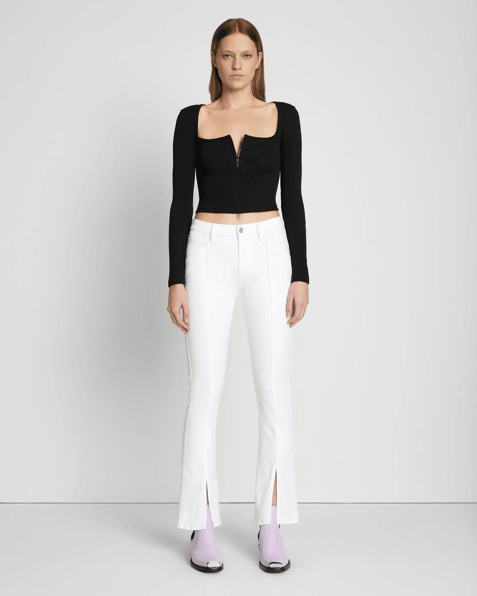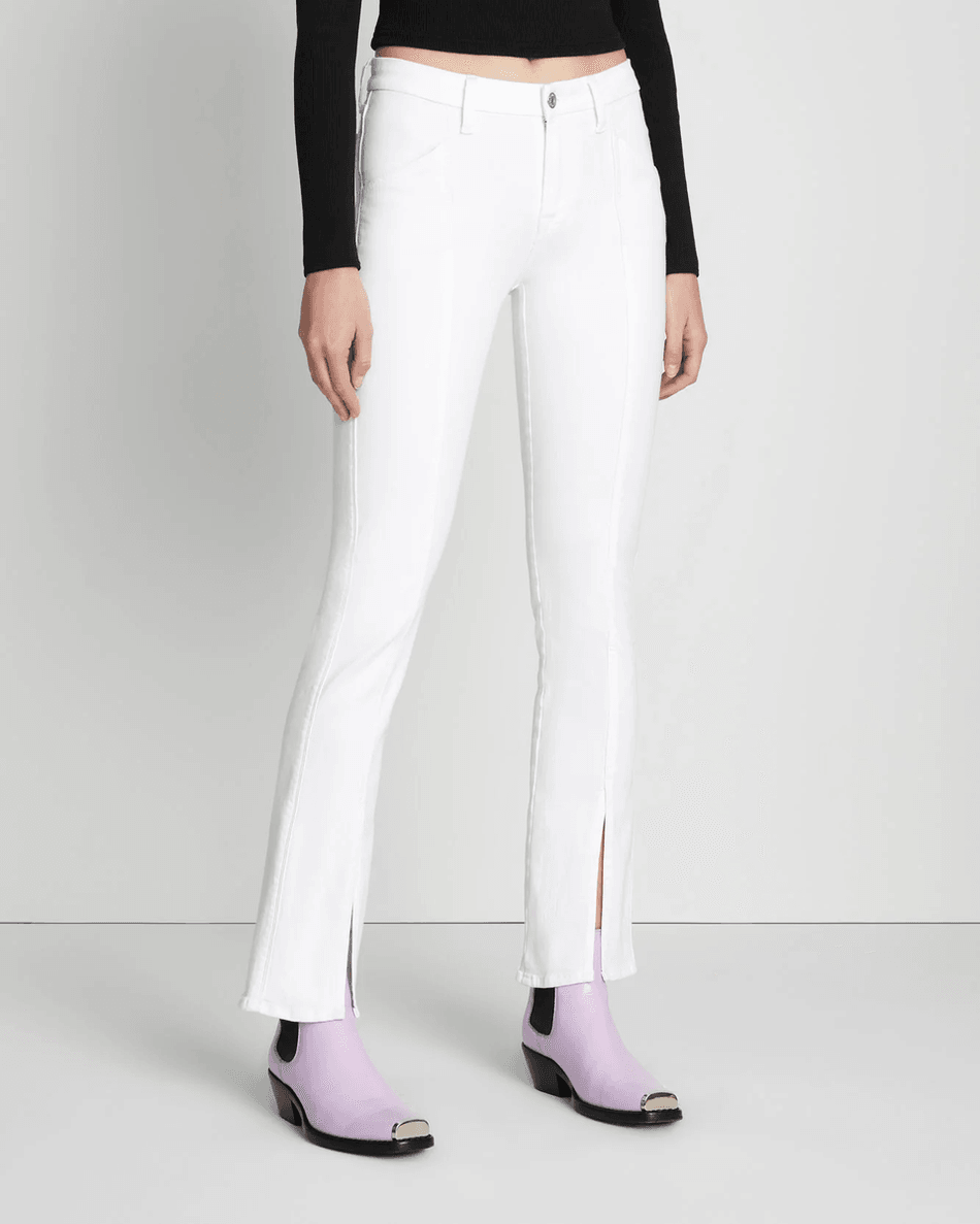 Elevate your wardrobe with the 7 For All Mankind Slim Illusion Kimmie Straight in White White. These jeans redefine classic style with a modern twist, featuring fashion-forward front split hems and expertly crafted seaming. Perfect for any occasion, they combine comfort and sophistication effortlessly.