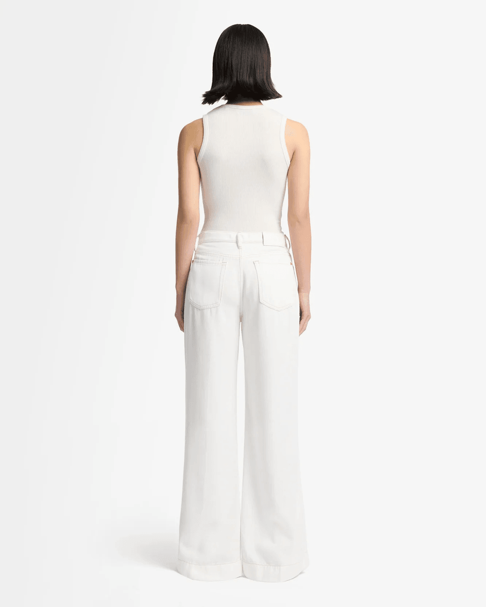 Step into style with the 7 For All Mankind Tailorless Denim Lustre Modern Dojo in Blanc Blanc. This high-rise wide-leg denim offers a full-length silhouette that flatters your figure, creating an elongated and elegant shape without the need for alterations. Experience the perfect blend of comfort and chic sophistication.