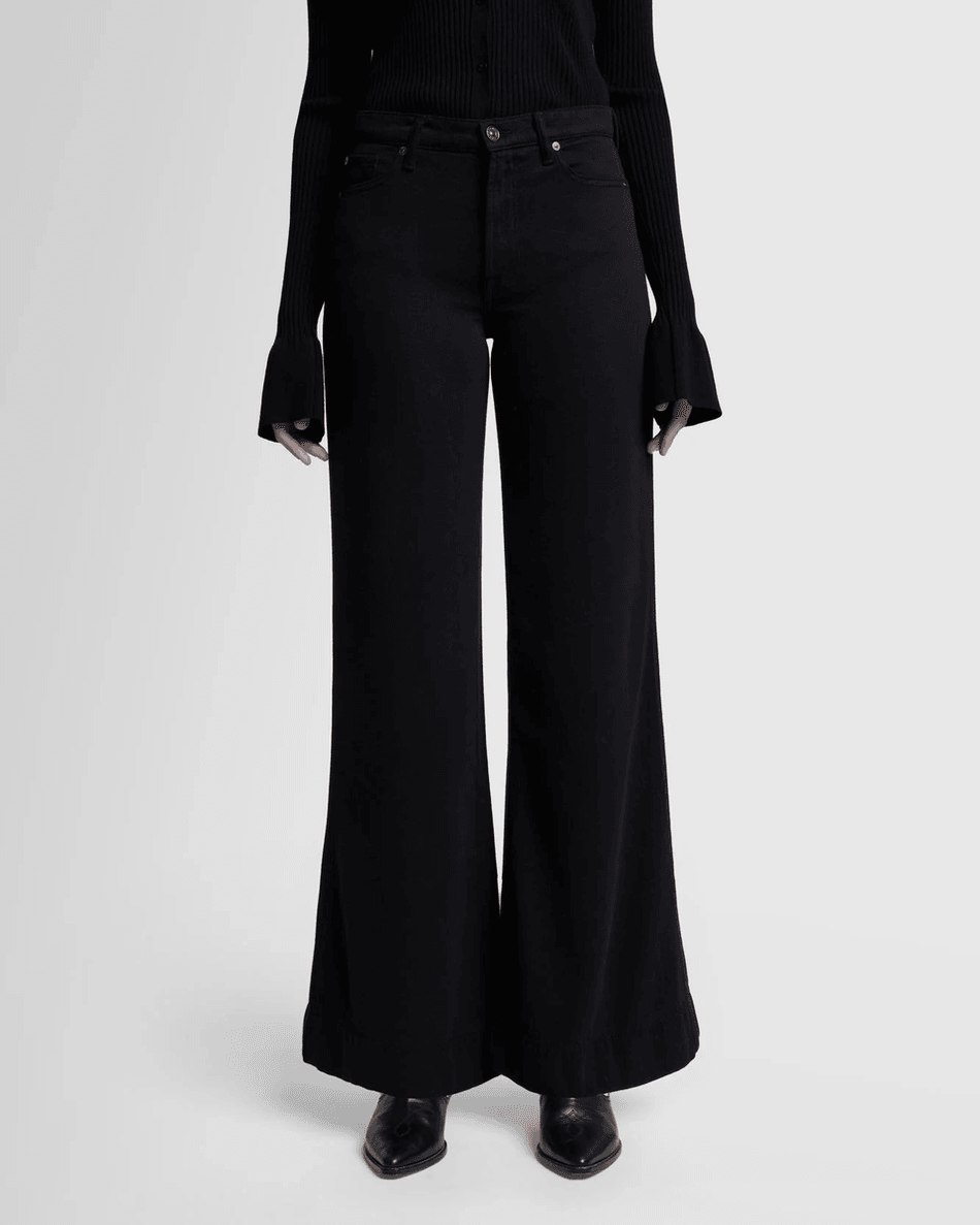 The 7 For All Mankind Tailorless Denim Lustre Modern Dojo in Raven Raven is fitted through the hips and thighs, culminating in a stylish wide flare leg finish. This unique design not only flatters your figure but also adds a touch of sophistication to any outfit. The clean black wash and zip closure enhance versatility, making these jeans perfect for both casual outings and dressed-up occasions.