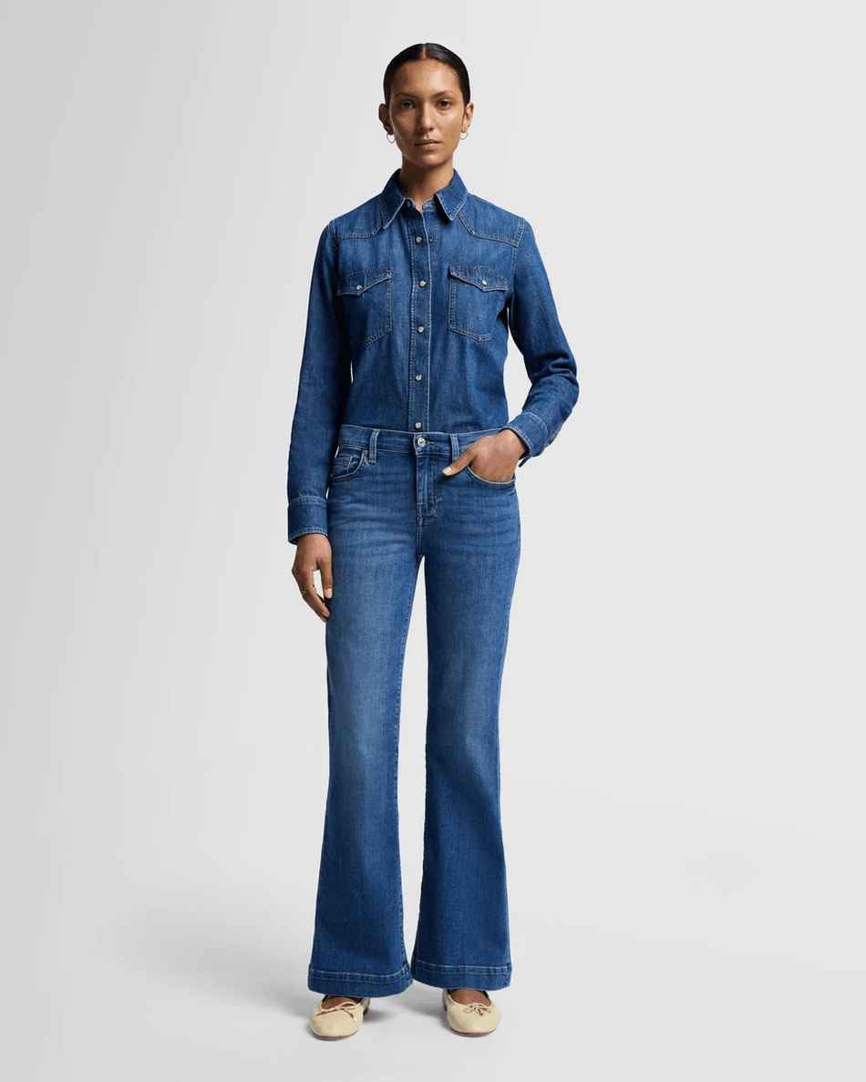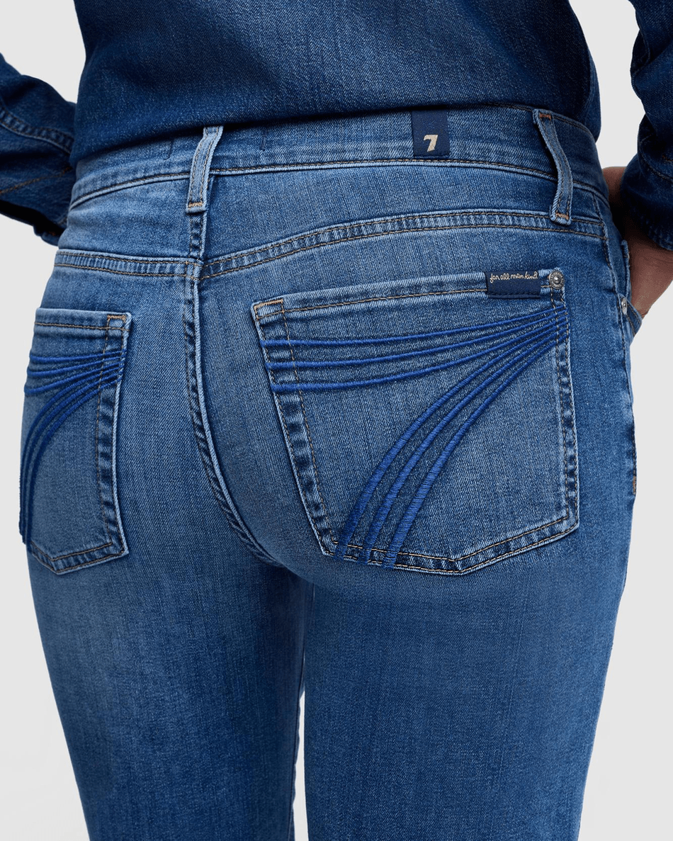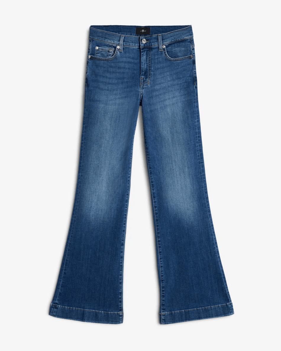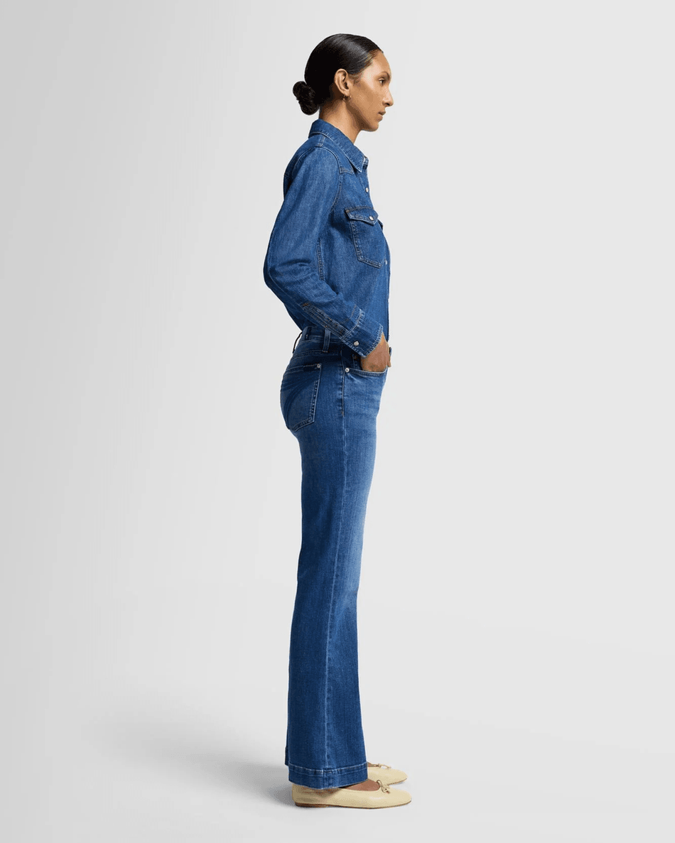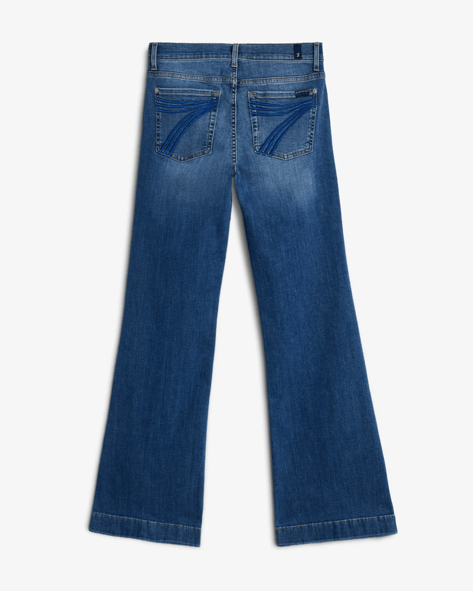 The 7 For All Mankind Tailorless Dojo in Marsh Marsh delivers a chic yet laid-back vibe. The mid-rise cut and wide-leg design create a long, lean silhouette that flatters all body types. With a shorter inseam than the original Dojo, these jeans are ready to wear straight from the store—no need for tailoring. The medium blue wash paired with subtle whiskering gives these jeans an authentic, classic look.