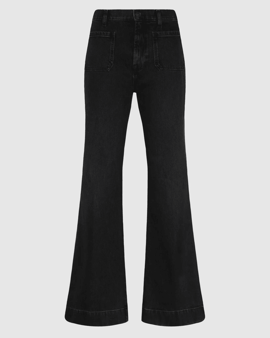 The 7 For All Mankind Tailorless Modern Dojo in Thunder Thunder features a fitted design through the hips and thighs, leading to a chic wide flare leg that enhances any silhouette. This versatile piece is perfect for both casual outings and dressier occasions, making it a staple for any wardrobe.