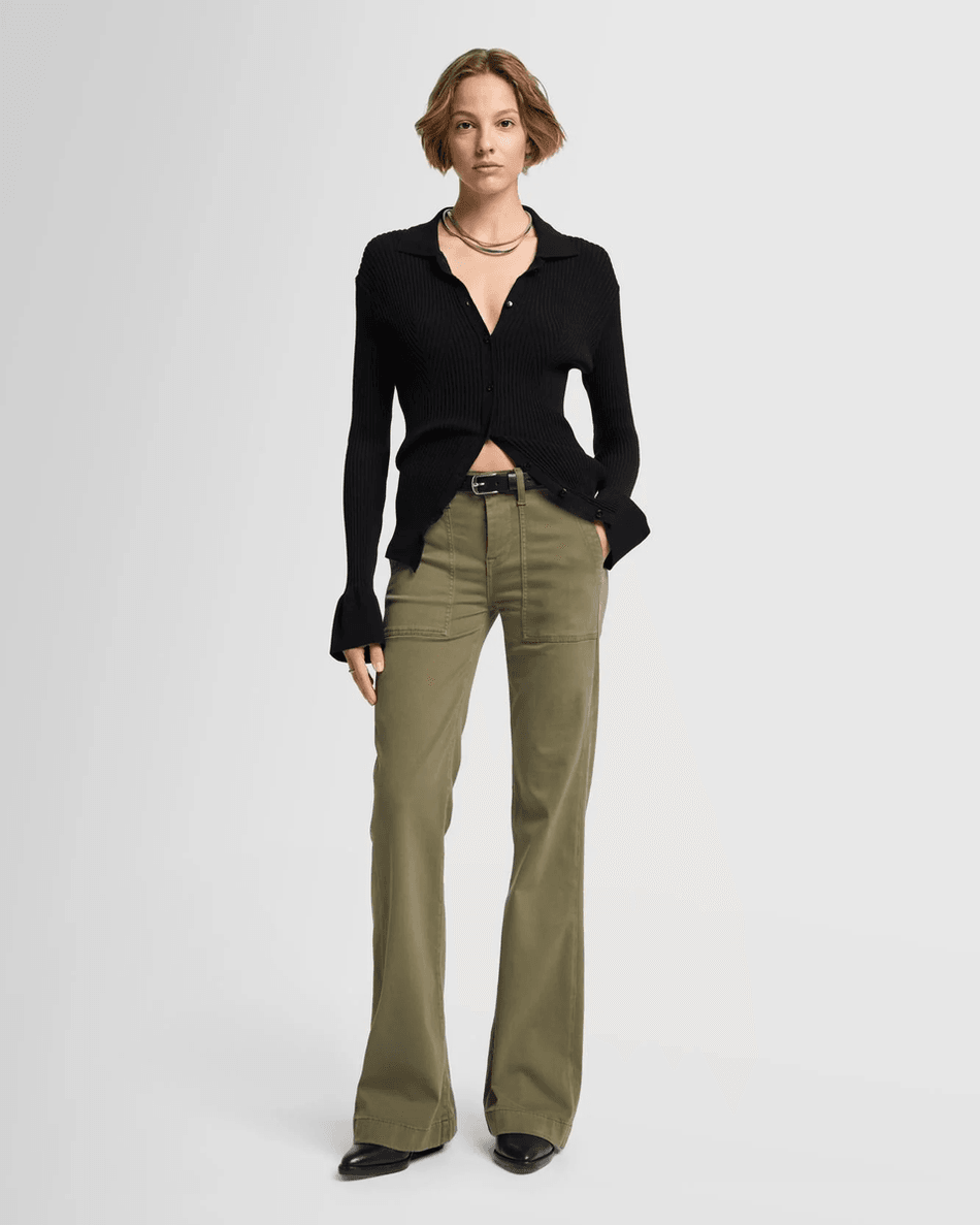 The 7 For All Mankind Utility Dojo in Army Green is designed to enhance your everyday style without compromising on comfort. The fitted design through the hips and thighs creates a flattering profile, while the signature flare adds a fashionable twist. The army green color adds a subtle pop to any outfit, making it versatile for various occasions—be it casual outings or more polished events.