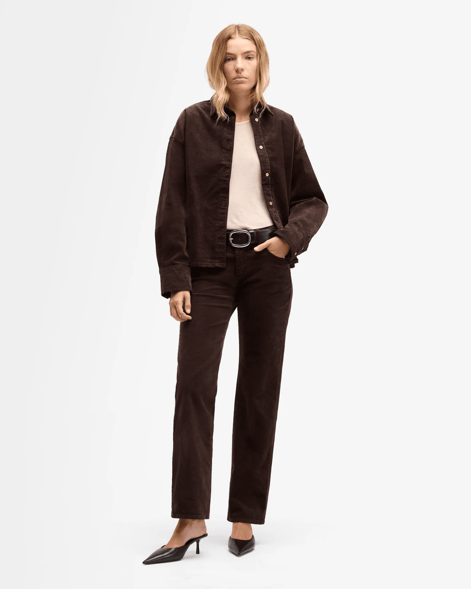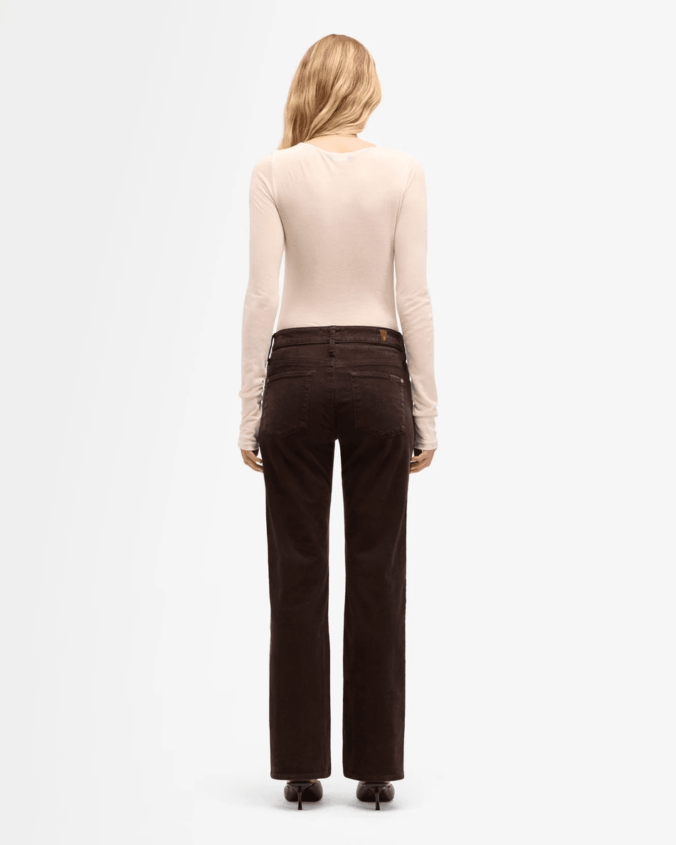 The 7 For All Mankind Corduroy Calie Straight in Coffee Bean features a sleek design that falls effortlessly through the legs, providing a flattering look on all body types. The luxurious ribbed corduroy fabric not only feels great against the skin but also ensures a firm and structured fit. With a clean back pocket and a zip fly with button closure, this pair combines practicality with style.