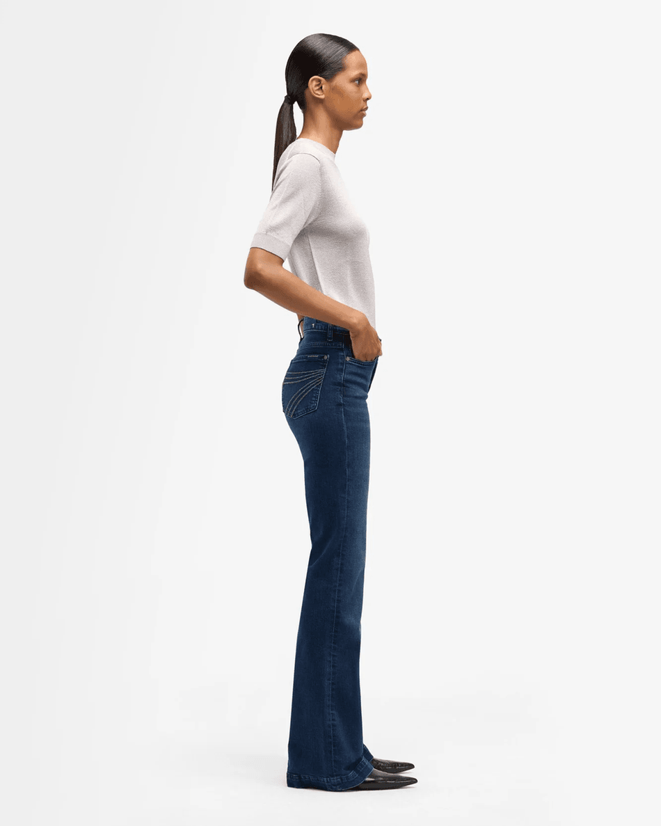 Elevate your denim game with the 7 For All Mankind Dojo in Spill Spill. This stylish mid-rise jean is designed to fit snugly through the hips and thighs, offering the perfect blend of comfort and sophistication. With a wide, full-length leg and a subtle flare, these jeans create a long, lean silhouette that flatters all body types.