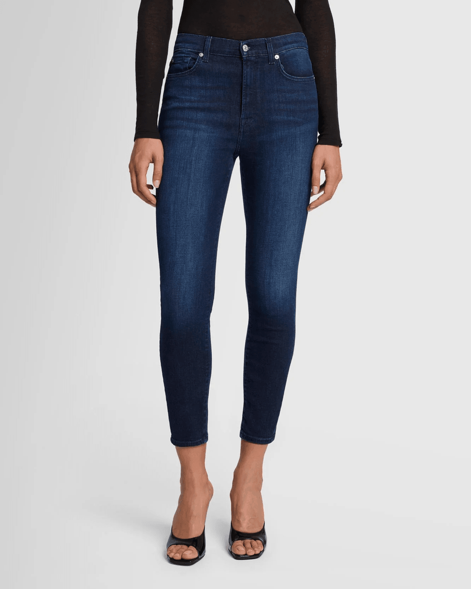 Elevate your denim collection with the 7 For All Mankind High Waist Ankle Skinny in Atlas Atlas. Designed for the modern woman, this high-rise skinny fit offers a flattering silhouette that crops elegantly at the ankles. Experience the perfect blend of style and comfort with this essential piece.