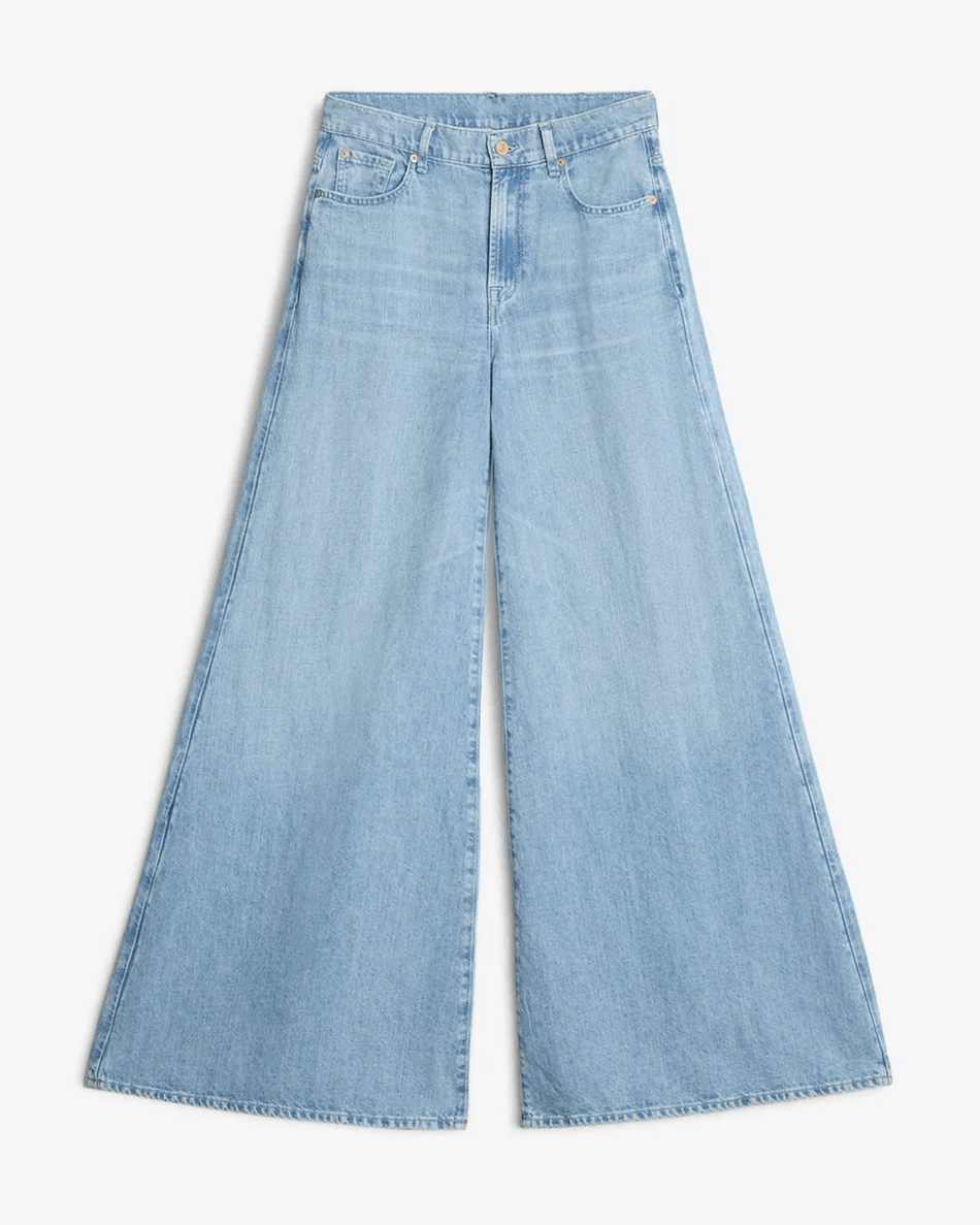 The 7 For All Mankind Indigo Linen Willow Palazzo Wide Leg in Kansas Kansas fits like a dream with its high-rise cut, providing an ultra-relaxed fit through the hips and thighs. This full-length leg style is crafted from a lightweight cotton-linen blend, making it ideal for warm days at the park or brunch with friends. The light wash and subtle fading enhance its trendy appeal, ensuring you stand out in any crowd.