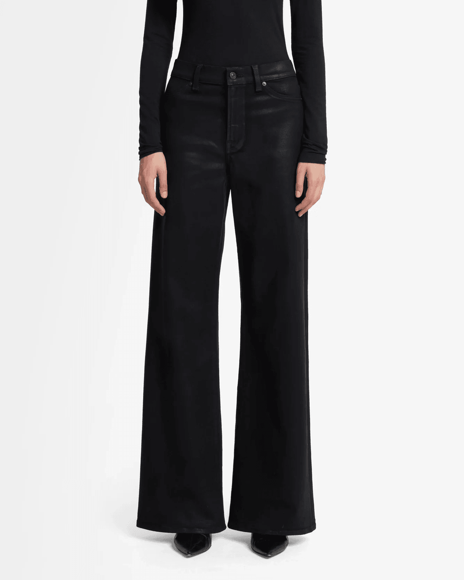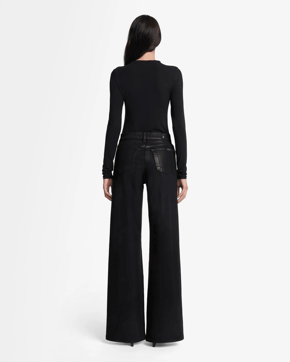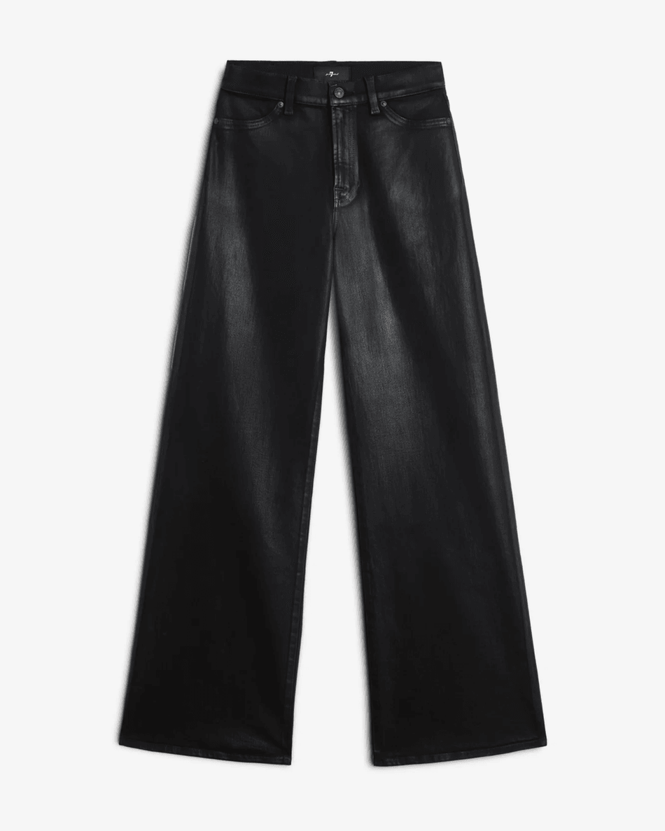 Elevate your style with the 7 For All Mankind Lotta in Coated Black. This stunning pair of jeans features a high rise fit that beautifully contours your waist and hips, transitioning into a full-length wide leg for a fashionable silhouette. Experience the unparalleled comfort and flexibility of premium 7 denim, now with the edgy look of coated black leather.