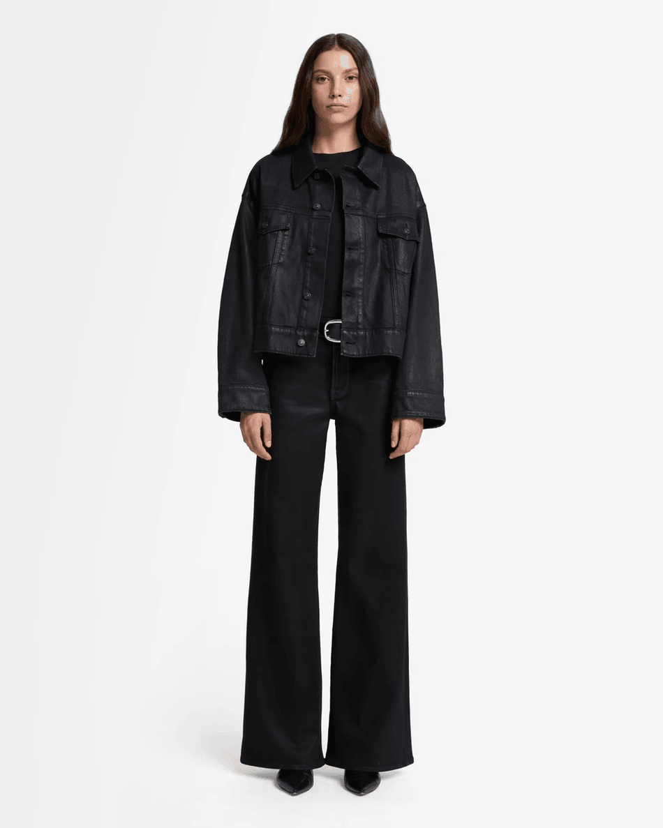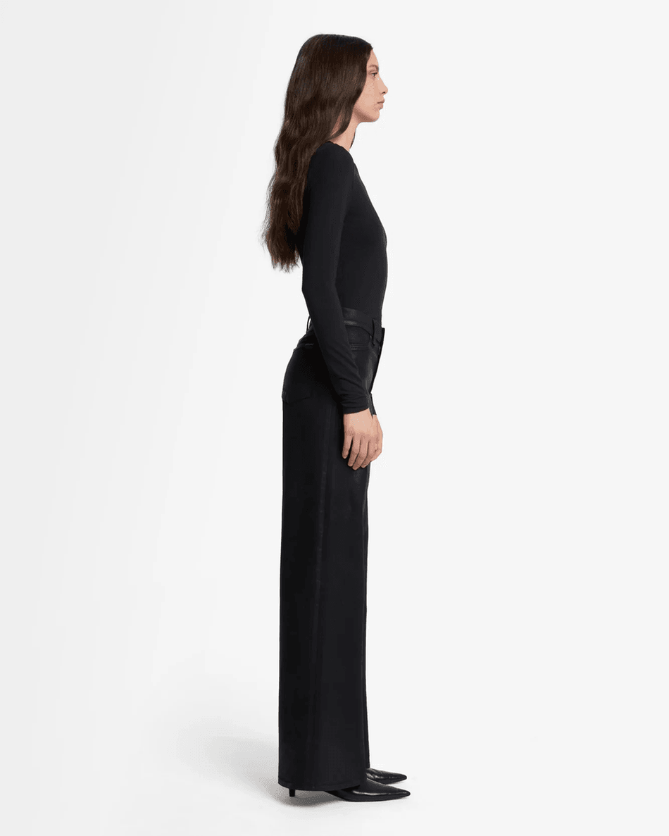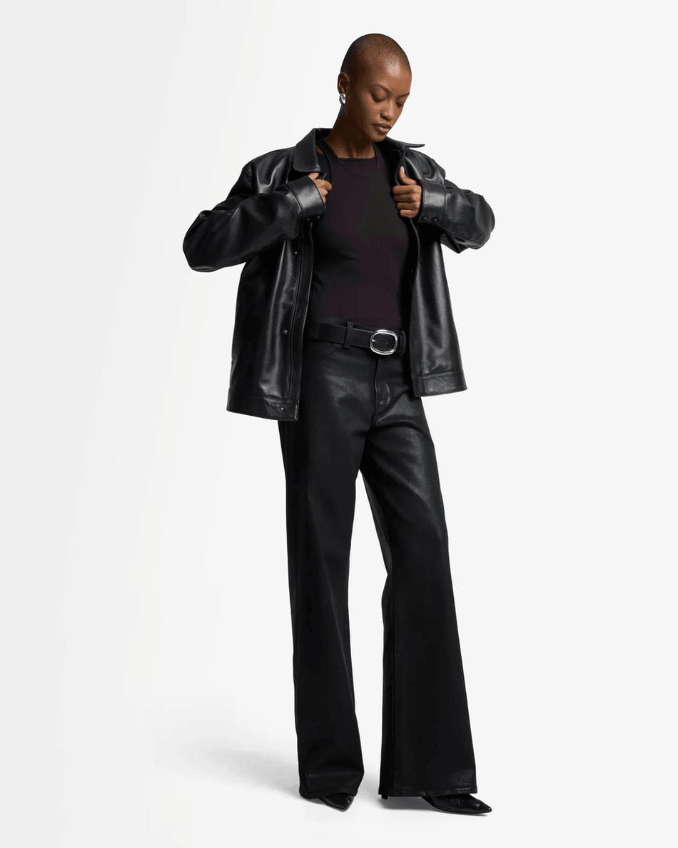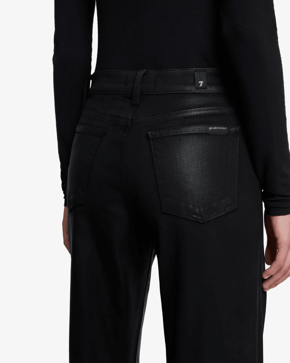 Elevate your style with the 7 For All Mankind Lotta in Coated Black. This stunning pair of jeans features a high rise fit that beautifully contours your waist and hips, transitioning into a full-length wide leg for a fashionable silhouette. Experience the unparalleled comfort and flexibility of premium 7 denim, now with the edgy look of coated black leather.