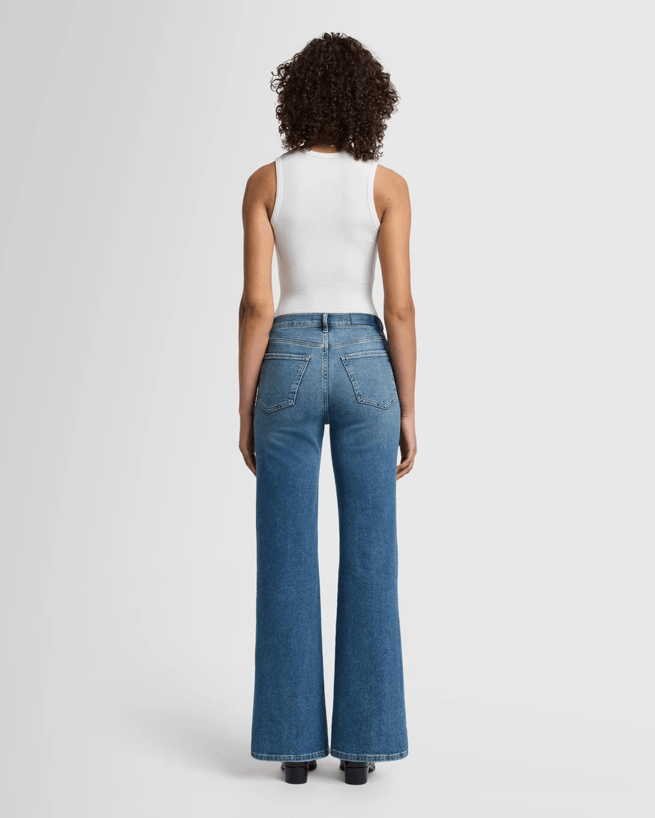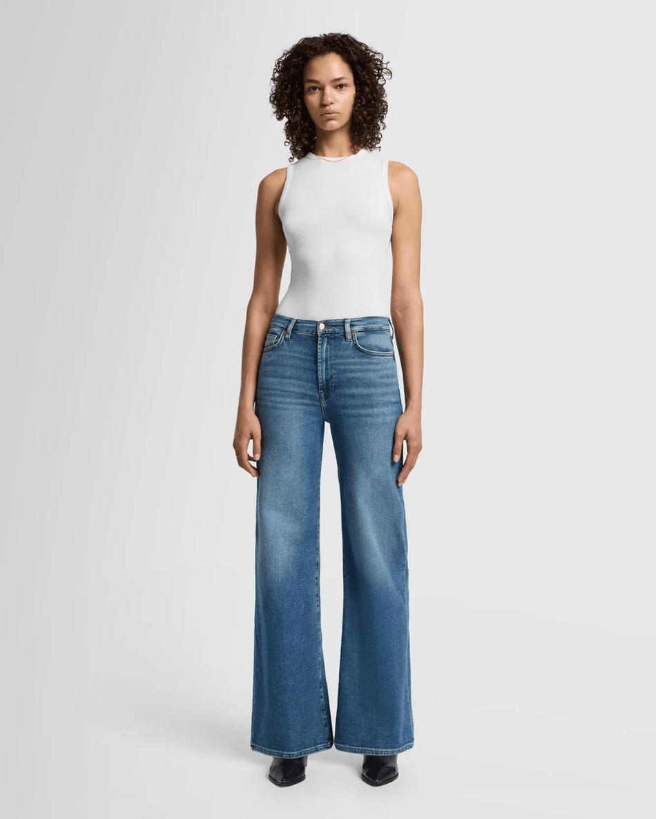 The 7 For All Mankind Luxe Vintage Ultra High Rise Jo in Sea Level features a flattering high waist and a full-length wide leg that provides a retro-inspired look. The medium blue wash enhances its vintage appeal, making it a versatile addition to your wardrobe. Pair it with a fitted top for a chic day out or style it with a sweater for cozy evenings.