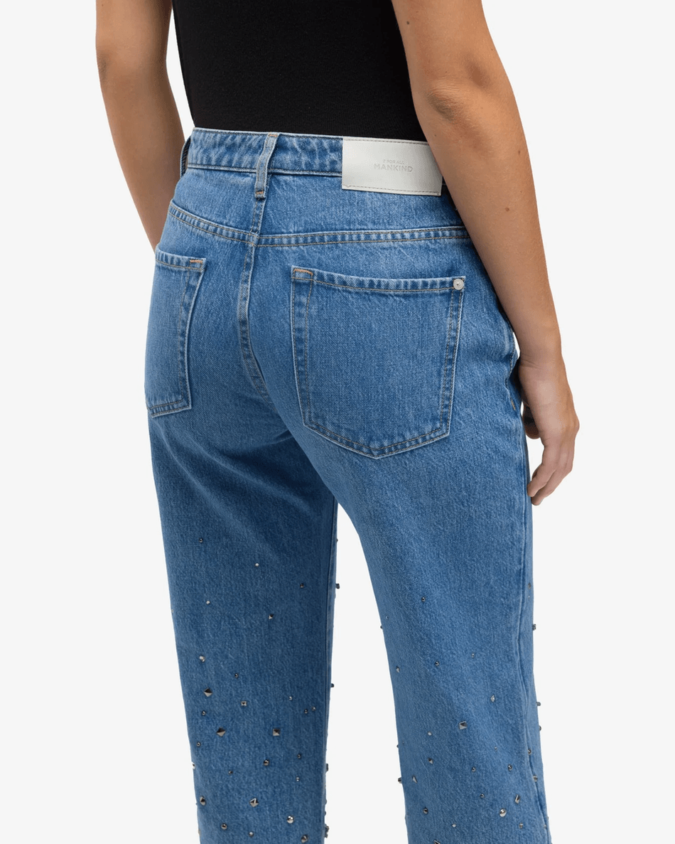 The 7 For All Mankind MANKIND Embellished Calie Straight Ankle is crafted from high-quality denim that feels structured yet softens beautifully with each wear. The medium wash provides a classic look, enhanced by subtle whiskering for that perfectly lived-in vibe.