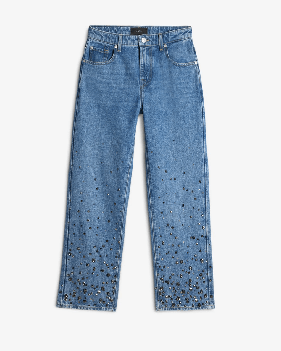 Elevate your denim collection with the 7 For All Mankind MANKIND Embellished Calie Straight Ankle in Dance Dance. This stylish piece combines comfort and sophistication, making it a must-have for any fashion-forward wardrobe.