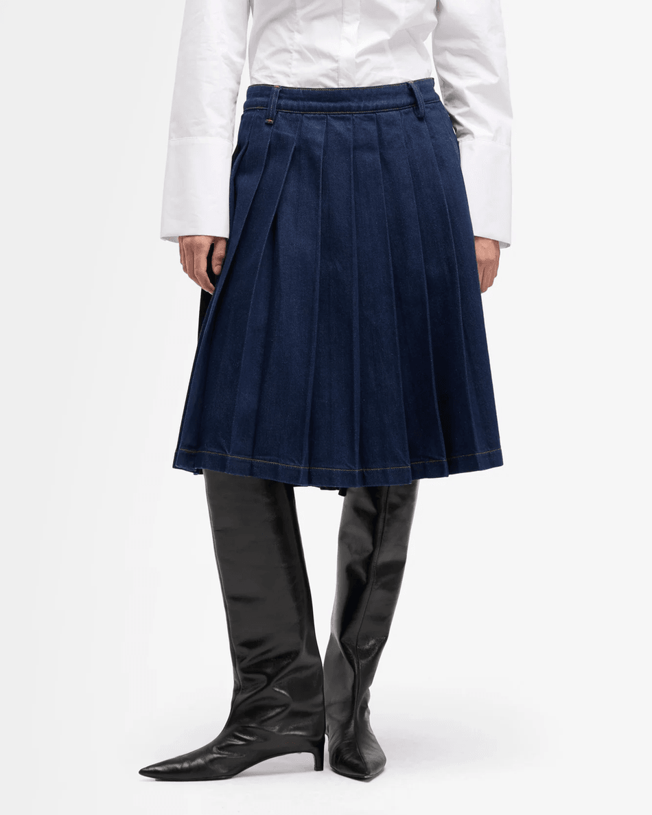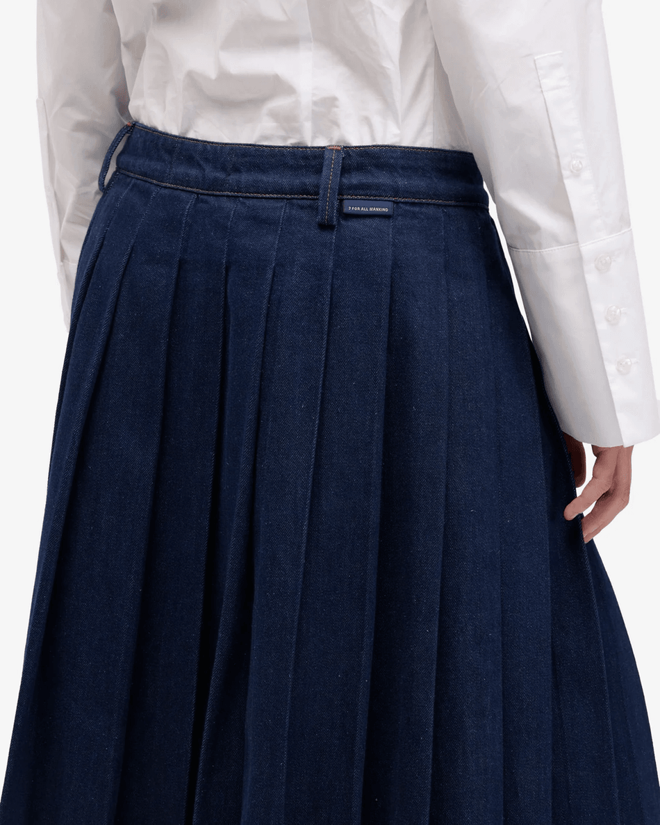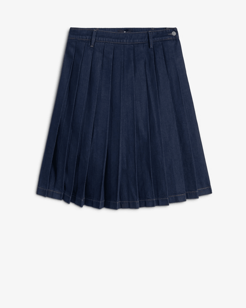 The 7 For All Mankind MANKIND Pleated Midi Skirt in Franklin Franklin features a dark wash that adds a touch of sophistication to your outfit. With a clean waistband equipped with belt loops and a secure zip closure, this skirt combines style with functionality. Its refined silhouette allows for effortless movement, making it ideal for day-to-night transitions.
