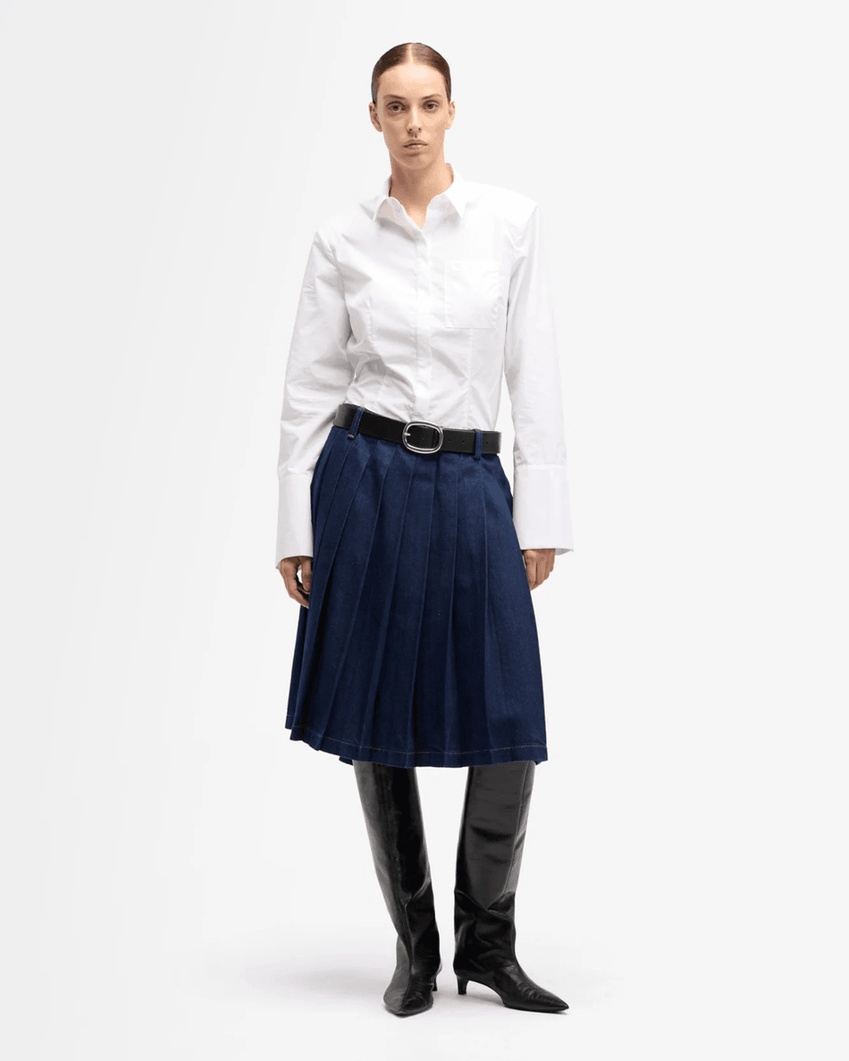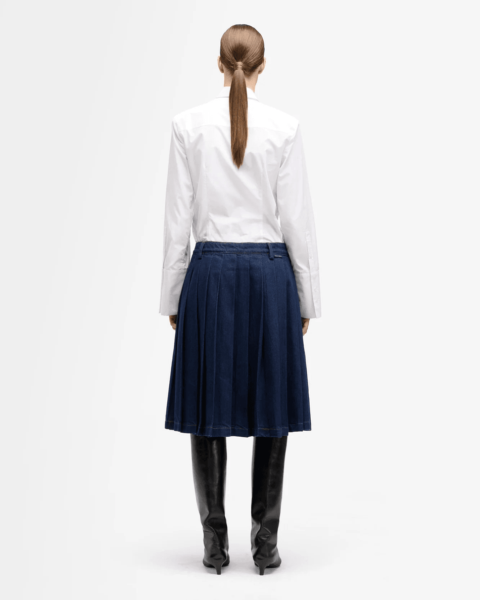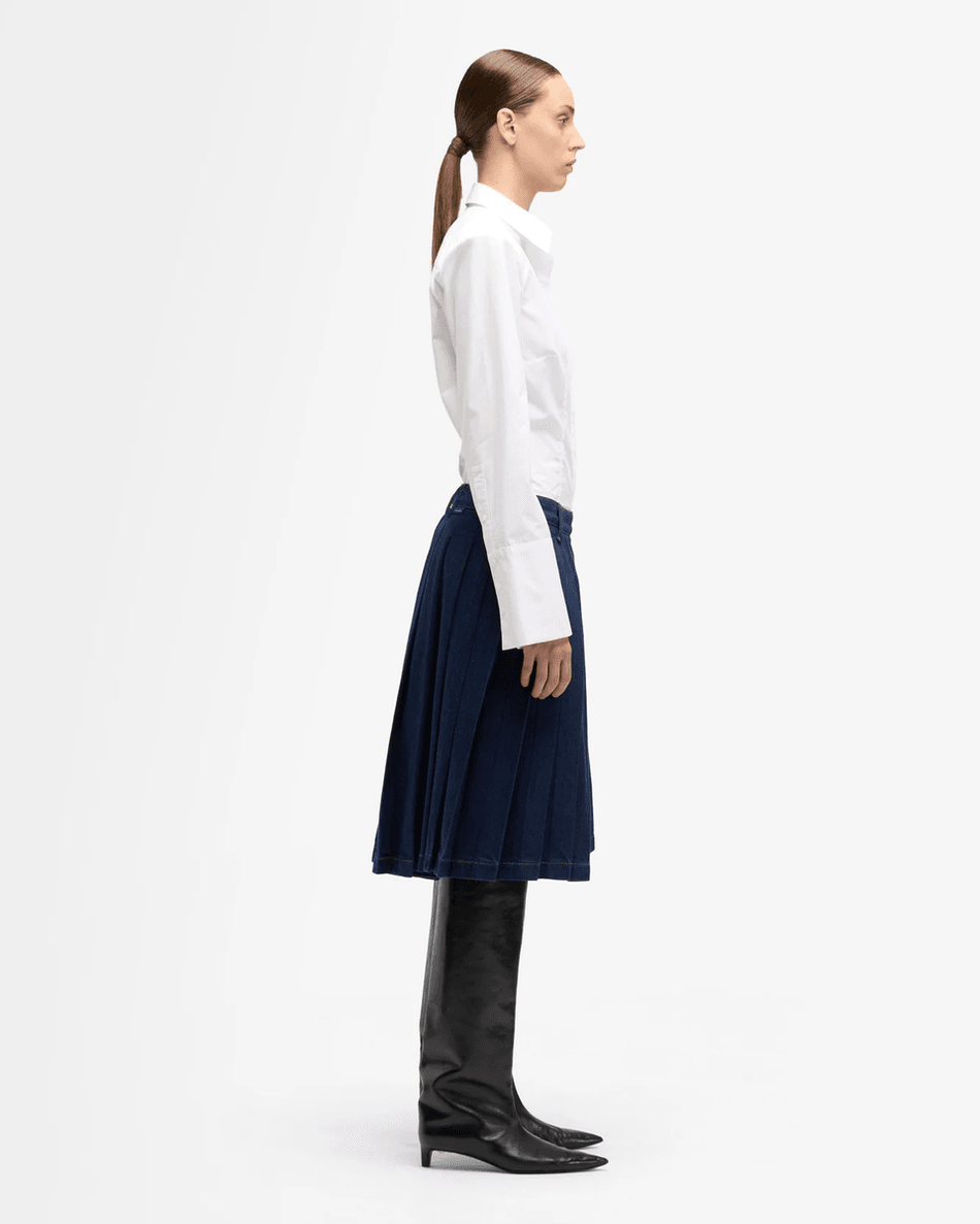 The 7 For All Mankind MANKIND Pleated Midi Skirt in Franklin Franklin features a dark wash that adds a touch of sophistication to your outfit. With a clean waistband equipped with belt loops and a secure zip closure, this skirt combines style with functionality. Its refined silhouette allows for effortless movement, making it ideal for day-to-night transitions.