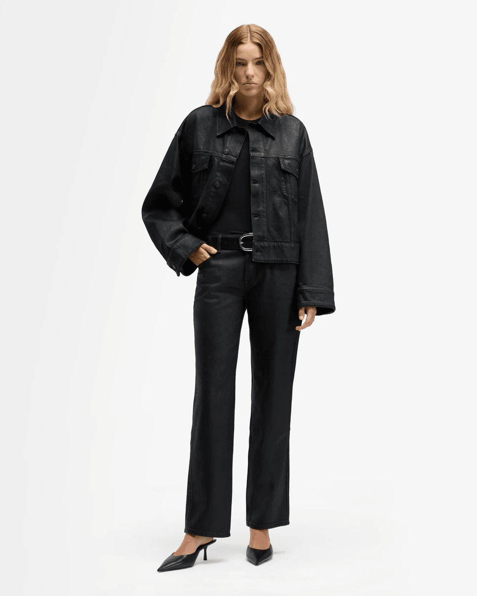 Elevate your style with the 7 For All Mankind Oli Cropped Trucker Jacket in Coated Blackcat. This modern twist on the classic trucker jacket combines edgy sophistication with everyday comfort. Its slightly cropped silhouette flatters the waist, making it the perfect companion for high-waisted outfits.