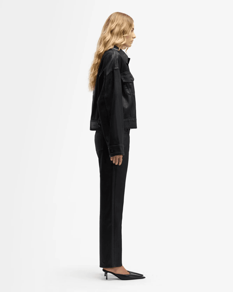 7 For All Mankind Oli Cropped Trucker Jacket in Coated Blackcat Blackcat