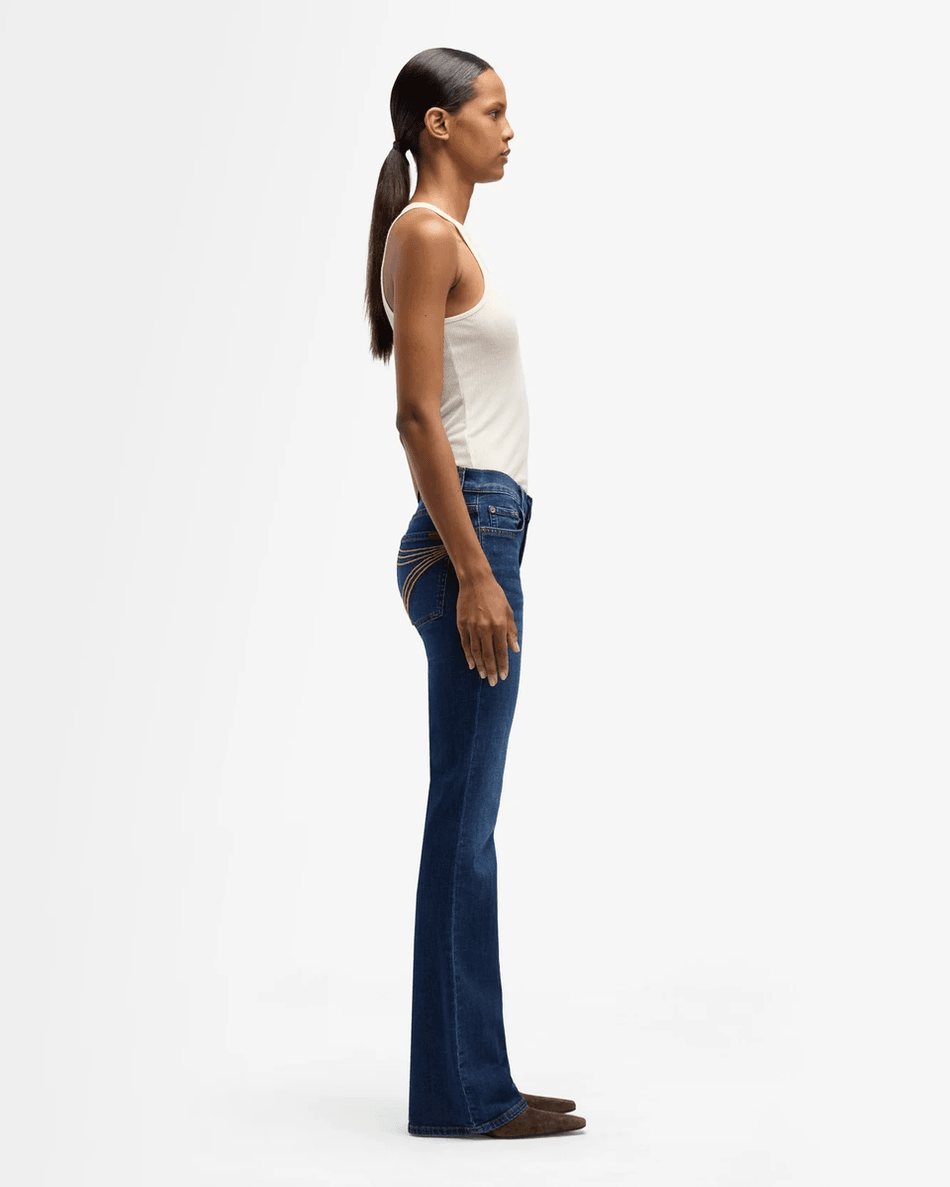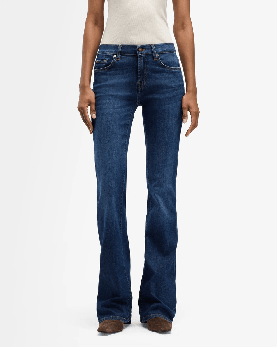 Elevate your denim game with the 7 For All Mankind Slim Illusion Original Bootcut in Rebellion. This iconic low-rise bootcut jean is designed to fit slim through the thighs and beautifully flare at the hem, creating a flattering and elongating silhouette that every woman desires.