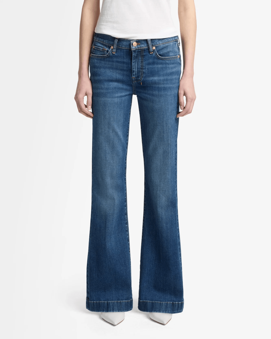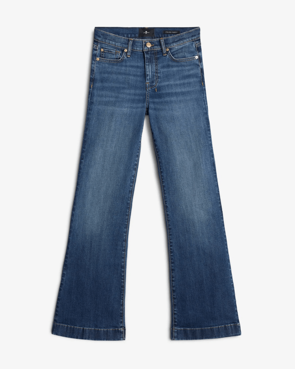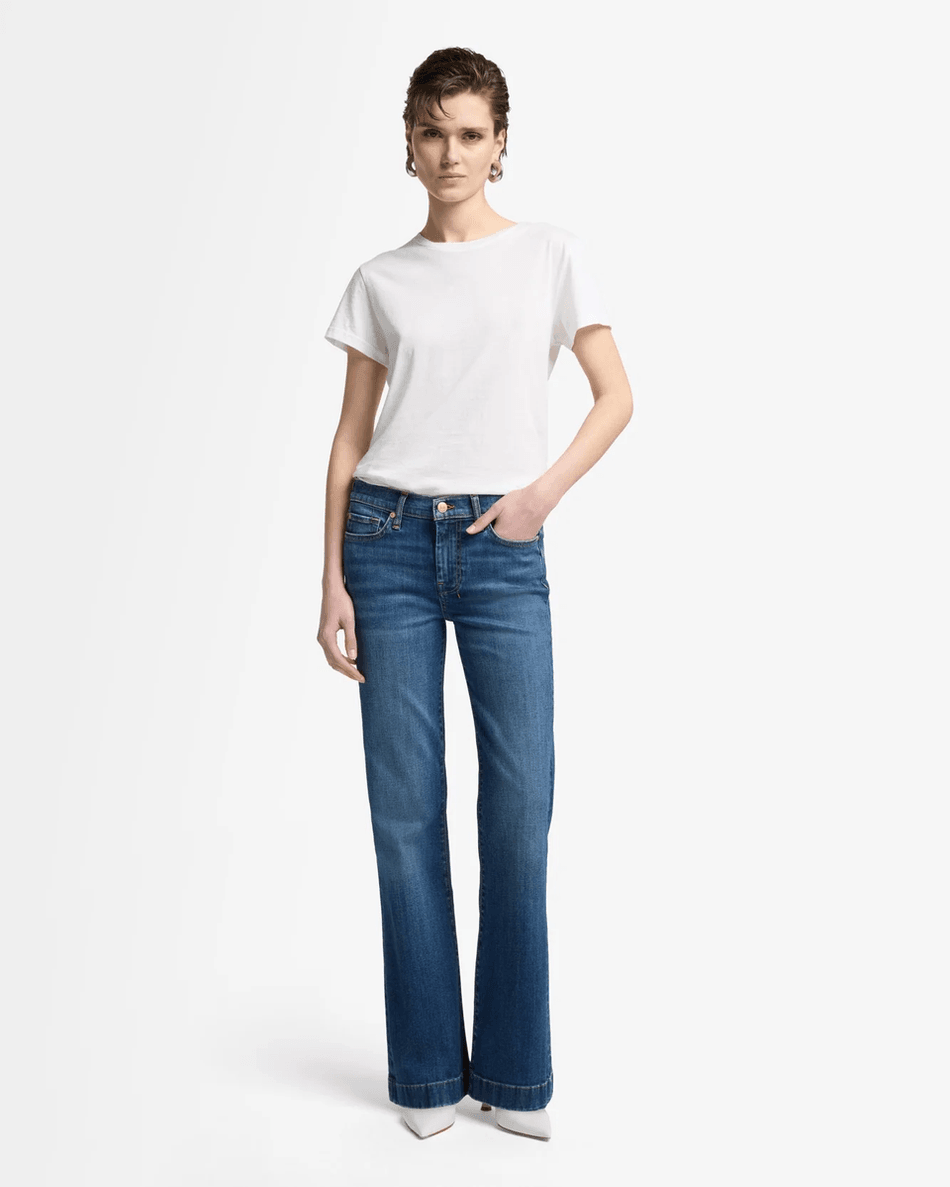 Elevate your wardrobe with the 7 For All Mankind Slim Illusion Tailorless Dojo in Royalty Royalty. This timeless wide-leg jean combines style and comfort, creating a flattering silhouette that fits you like a glove.