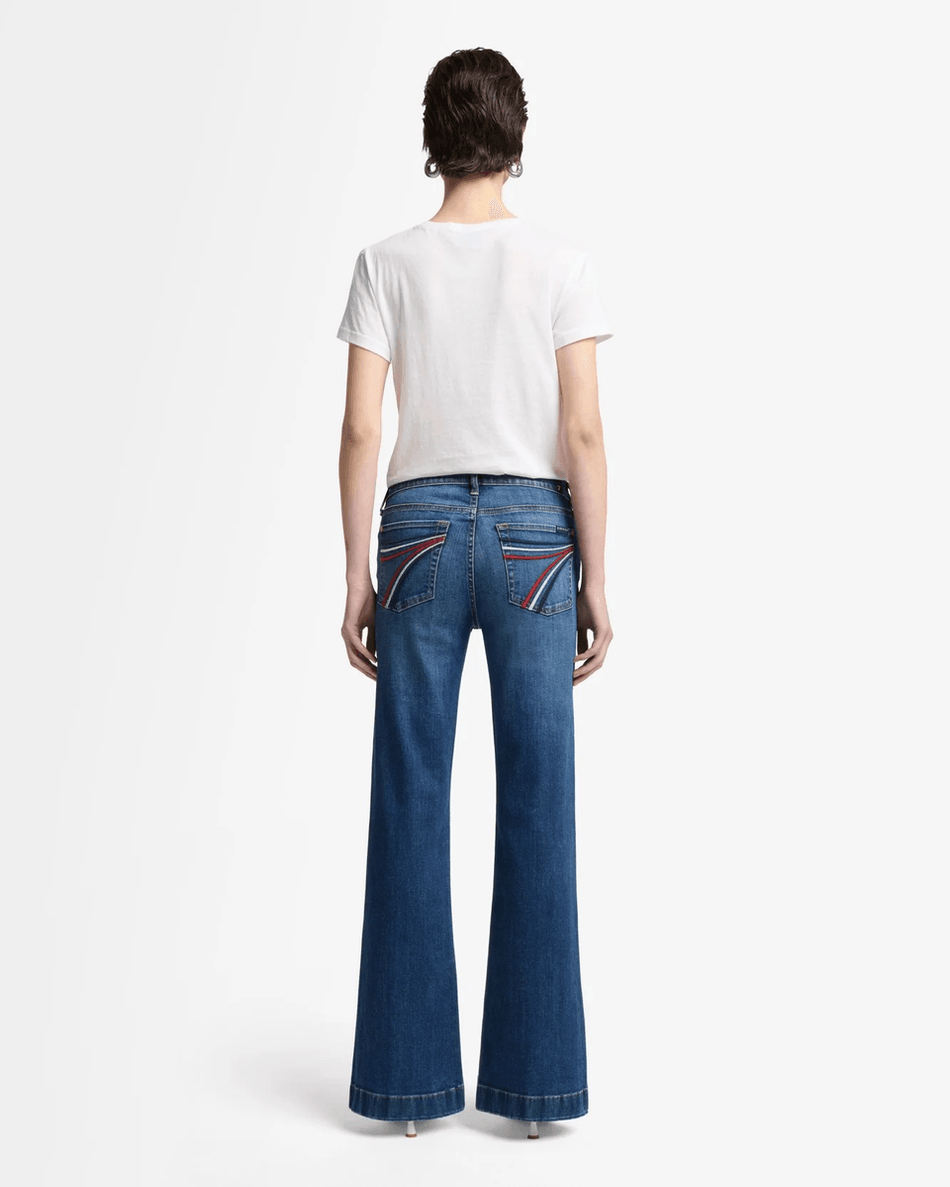 - Signature Style: Iconic 7 back pocket embroidery with Americana-inspired stitching.