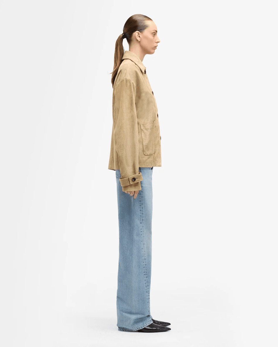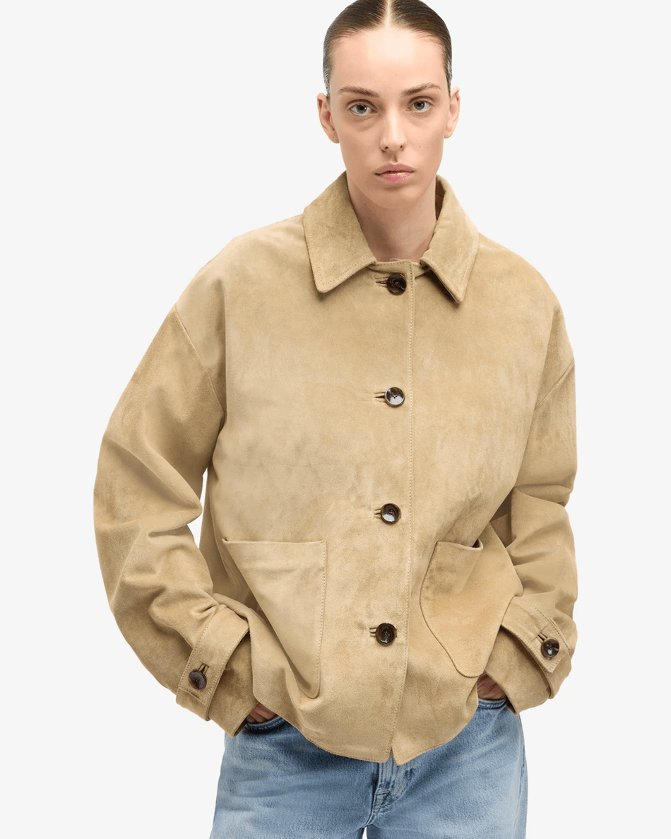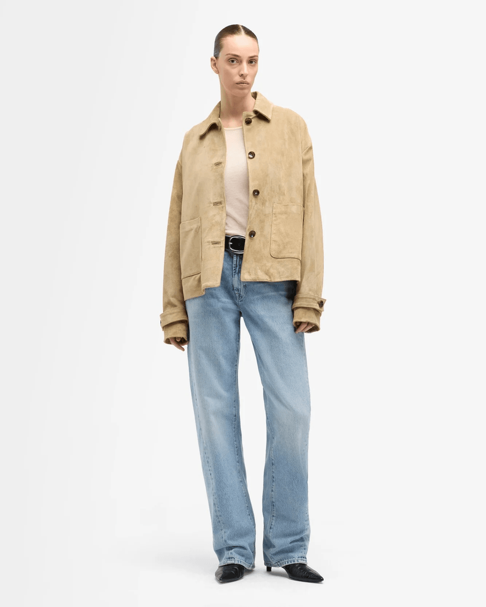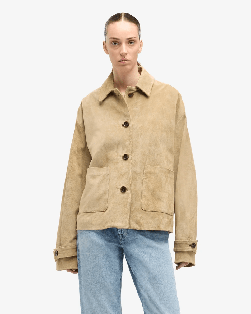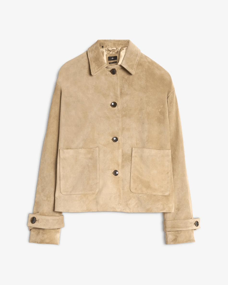Discover the 7 For All Mankind Suede Cropped Chore Jacket in Safari Safari
