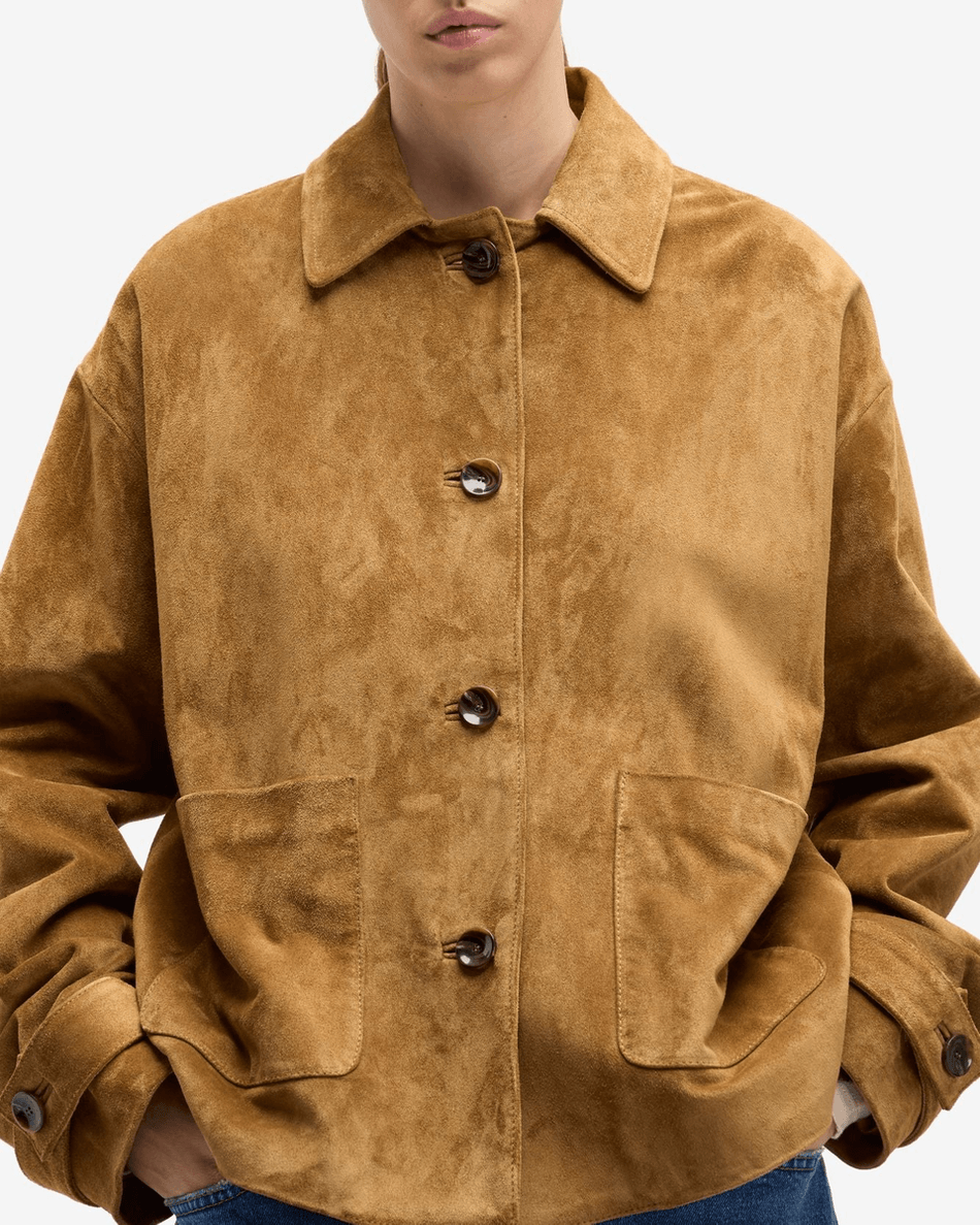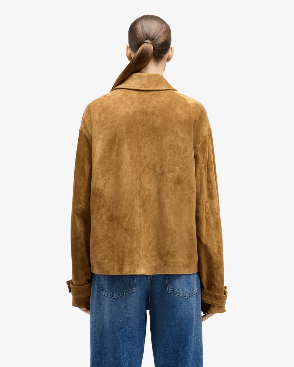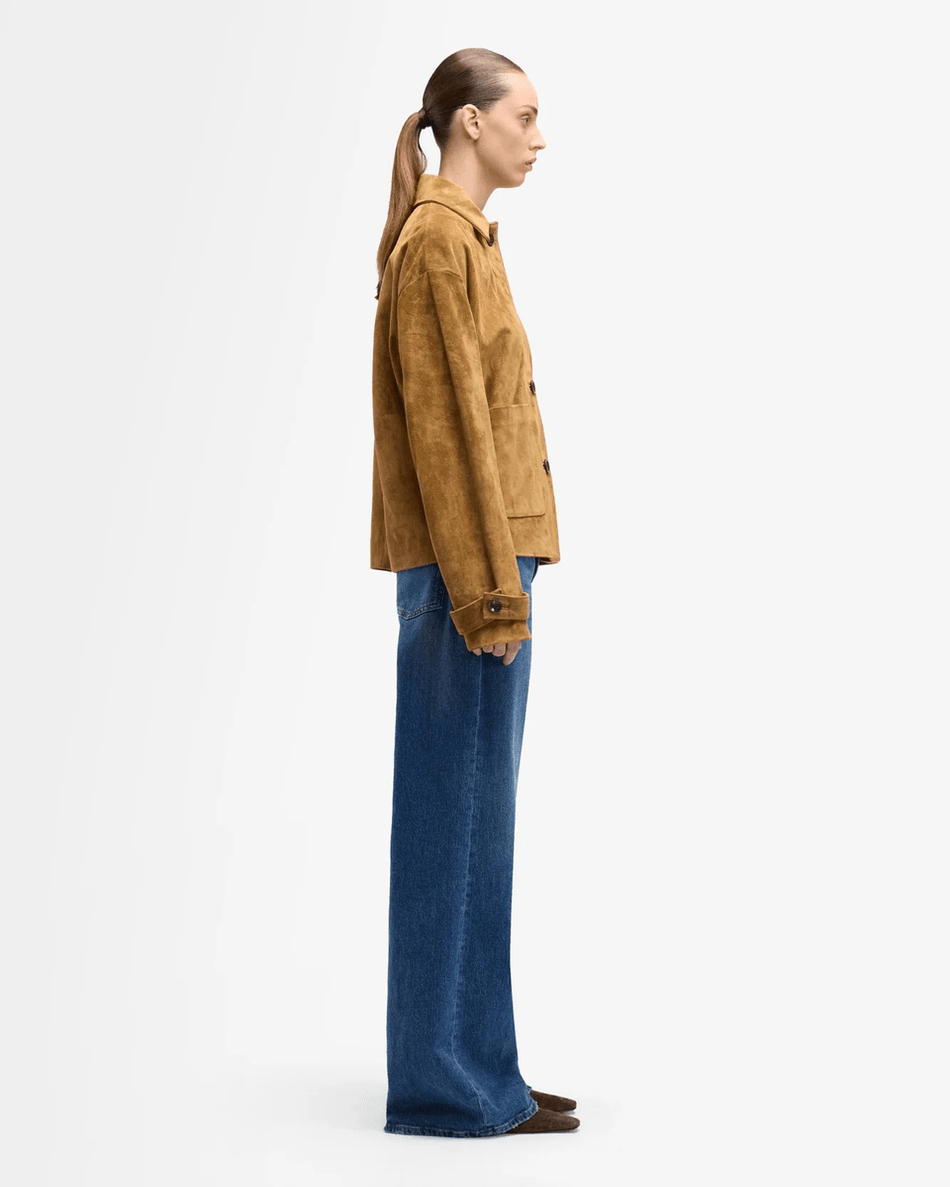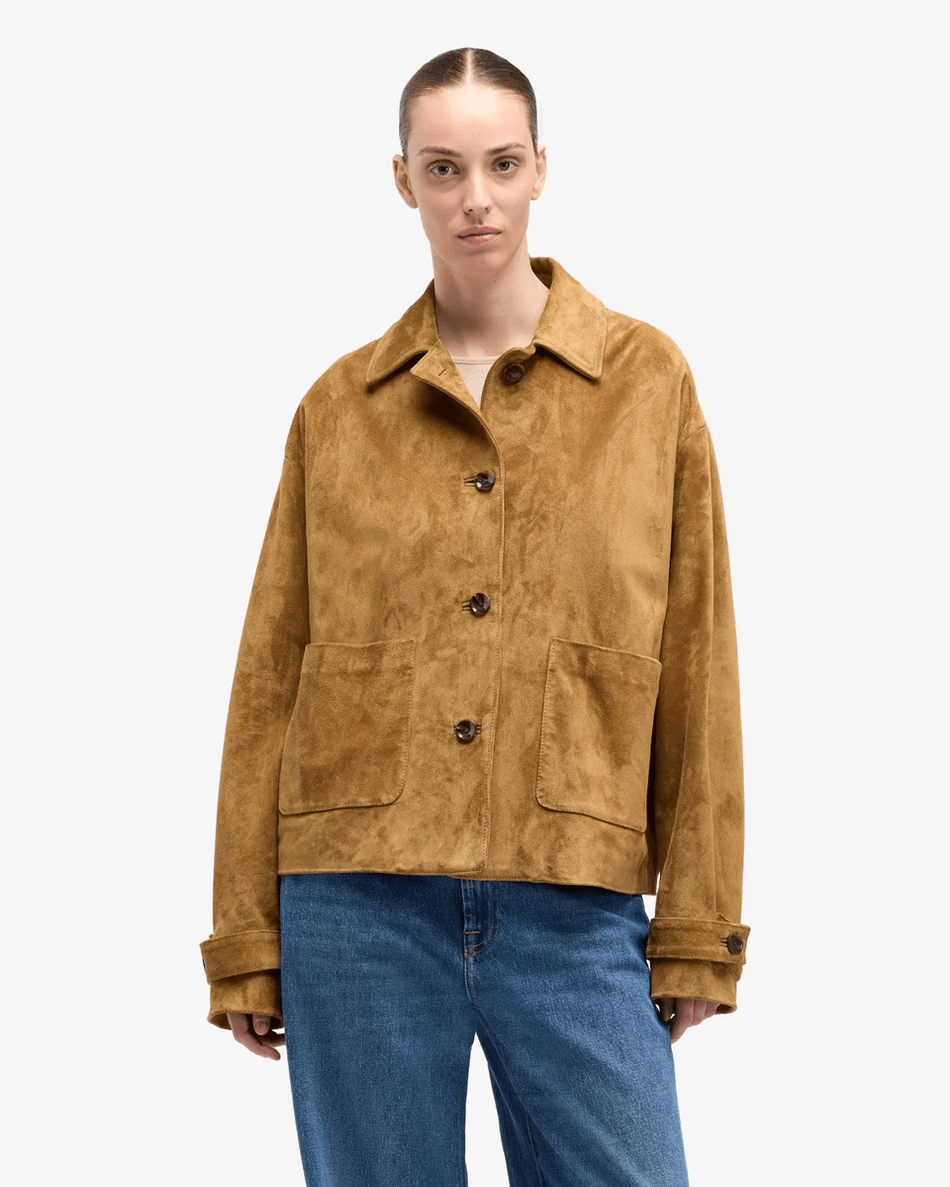 Discover the 7 For All Mankind Suede Cropped Chore Jacket in Tobacco