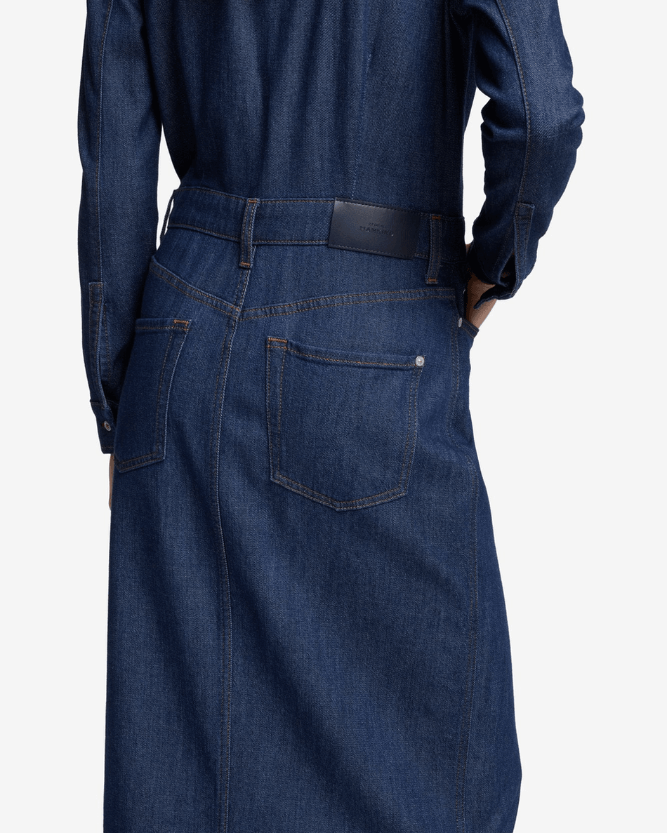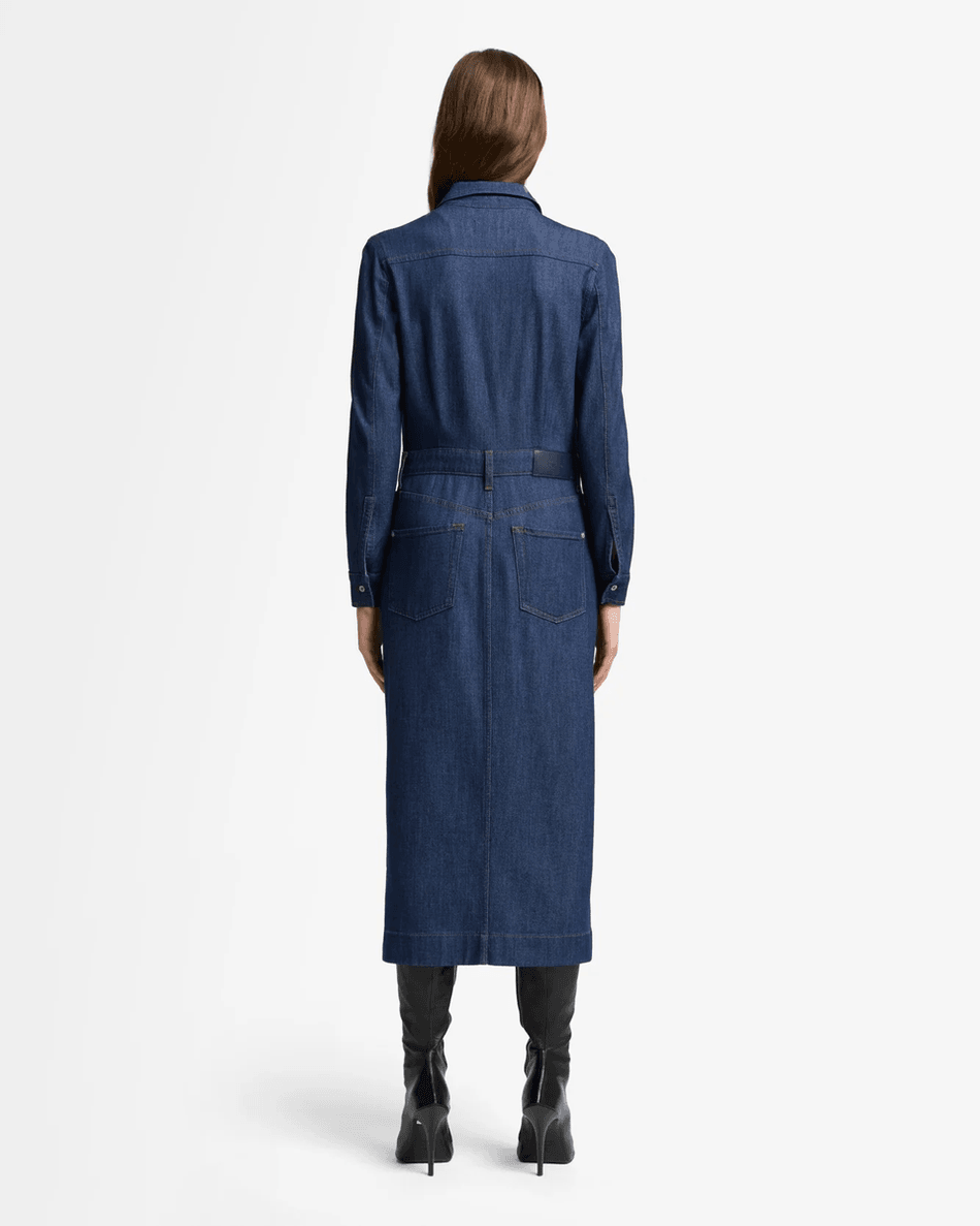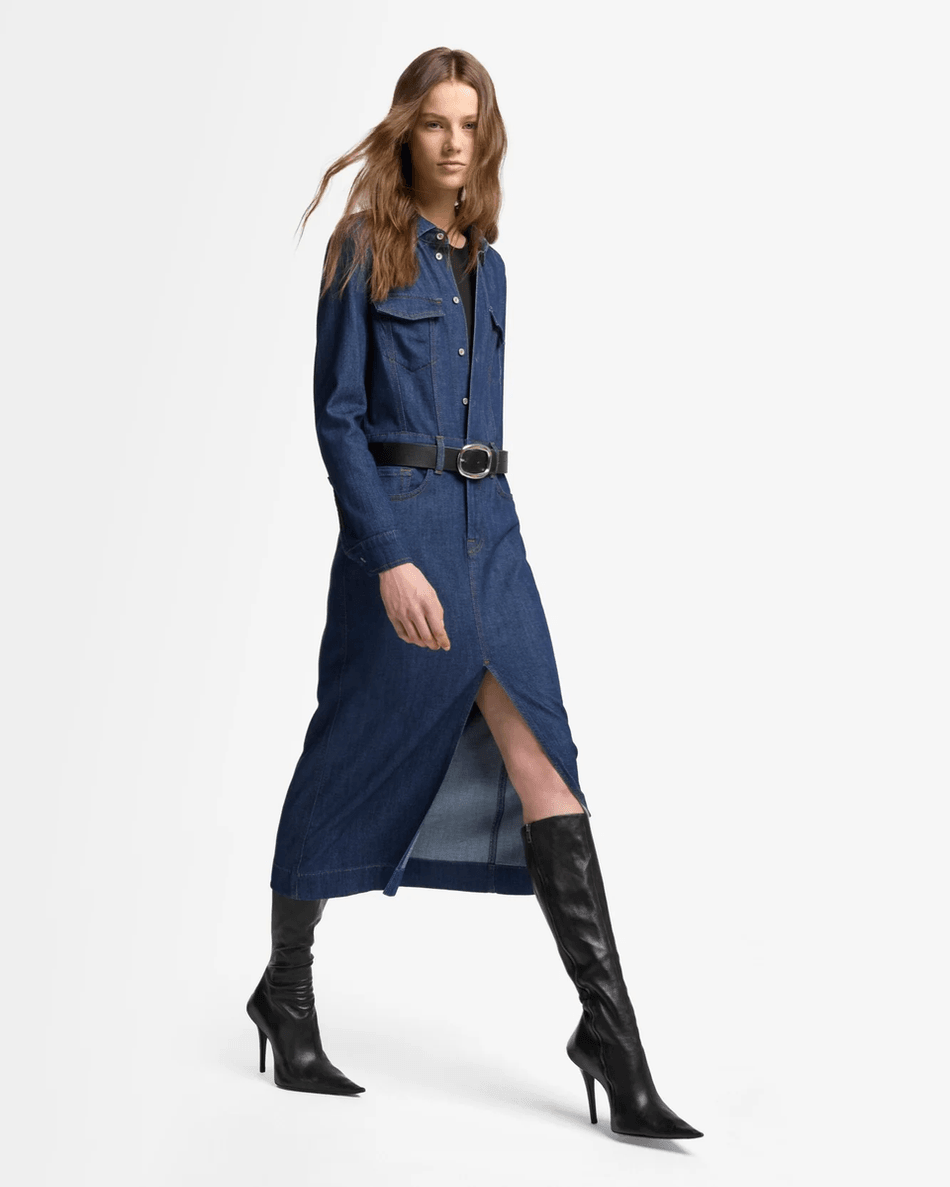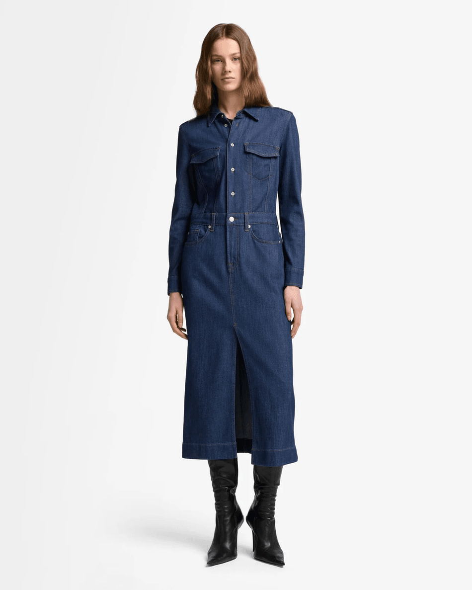 The 7 For All Mankind Weightless Denim Maxi Dress in Halona Halona is designed for the modern woman who values both style and comfort. The dress features dark wash denim with front seams and belt loops, enhancing its chic aesthetic. Long sleeves with a button-up closure add a touch of sophistication, making it ideal for both casual outings and dressed-up events.
