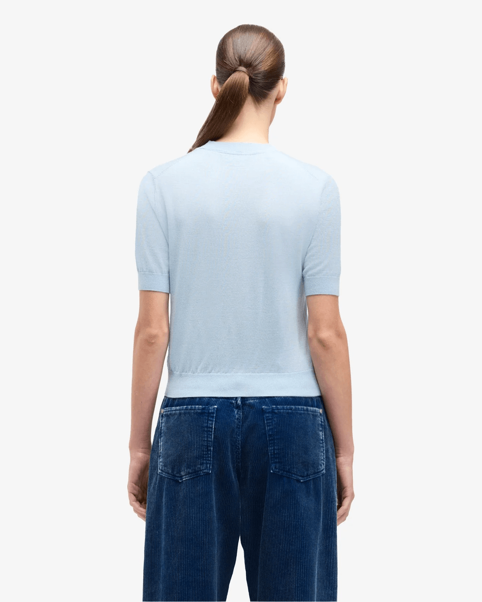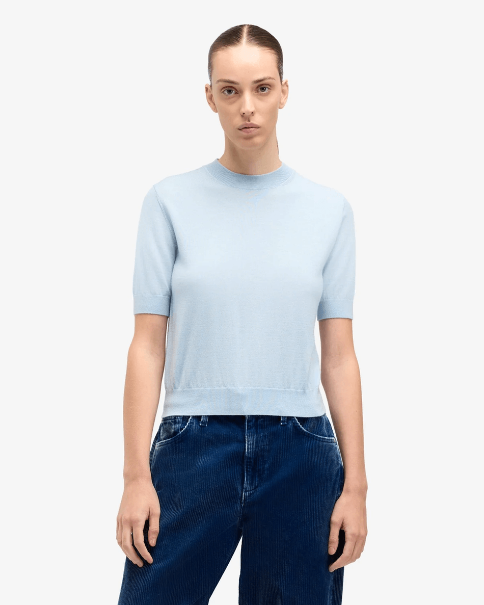 Discover the 7 For All Mankind Wool Short Sleeve Sweater in Cielo Cielo