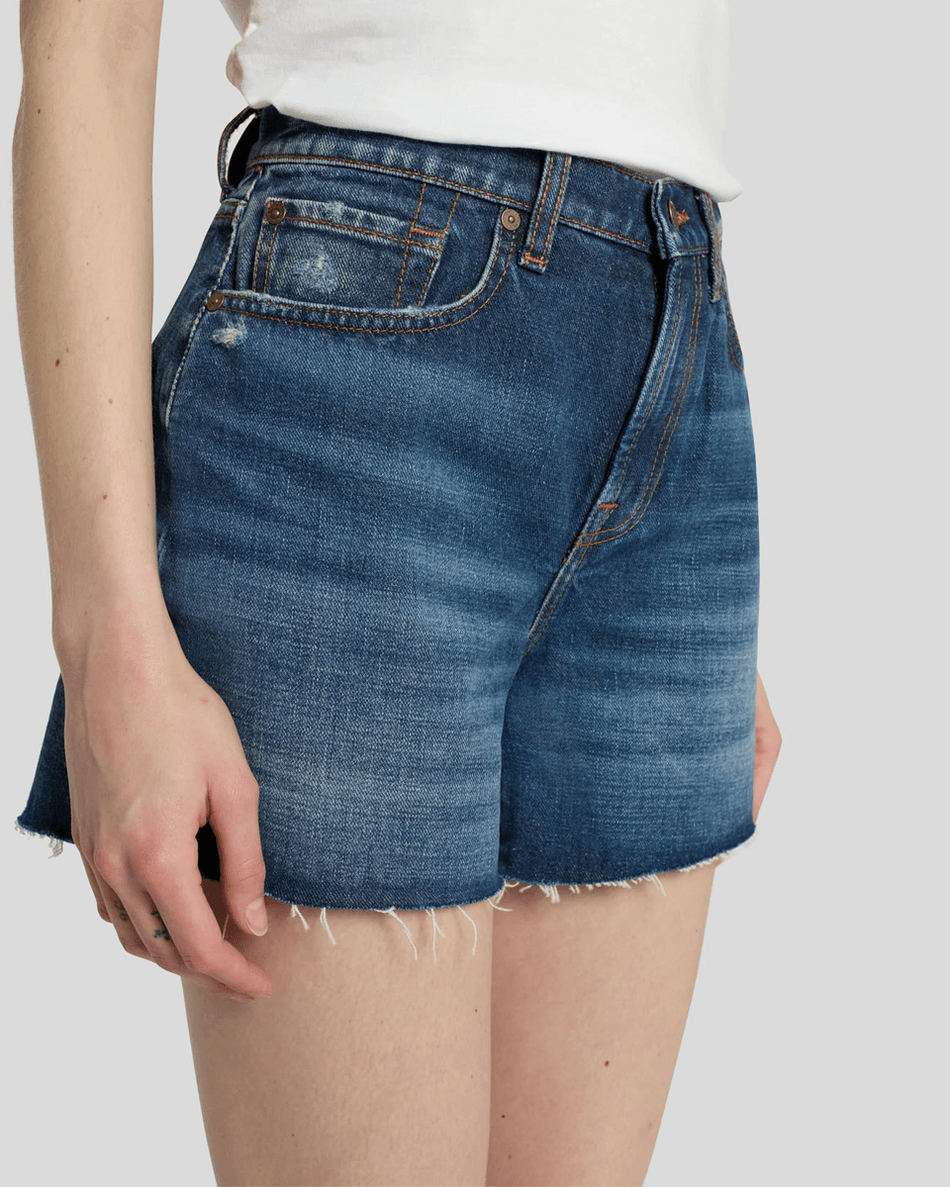 Elevate your summer wardrobe with the 7 For All Mankind Monroe Long Short in Bailey. These vintage-inspired high-rise shorts offer a flattering fit that accentuates your waist while providing exceptional comfort. Crafted with a stylish dark wash, they feature a trendy frayed hem and subtle whiskering for an authentic, lived-in look.