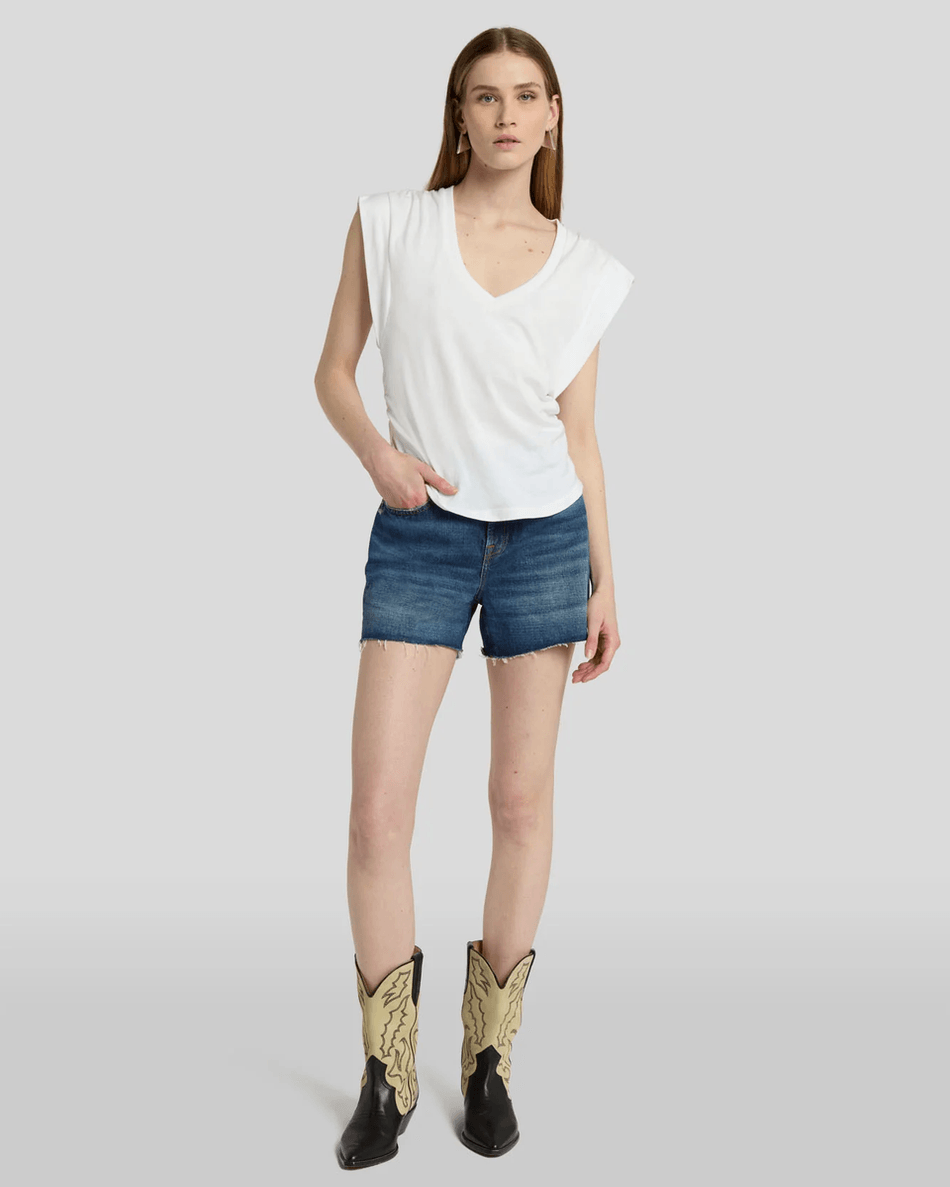 The 7 For All Mankind Monroe Long Short in Bailey combines fashion and function effortlessly. The high-rise cut not only flatters your figure but also provides comfort for all-day wear. These shorts are perfect for any casual outing, whether you’re enjoying a sunny day at the park or meeting friends for brunch. Their frayed hem adds a touch of edginess, making them a must-have for trendsetters.