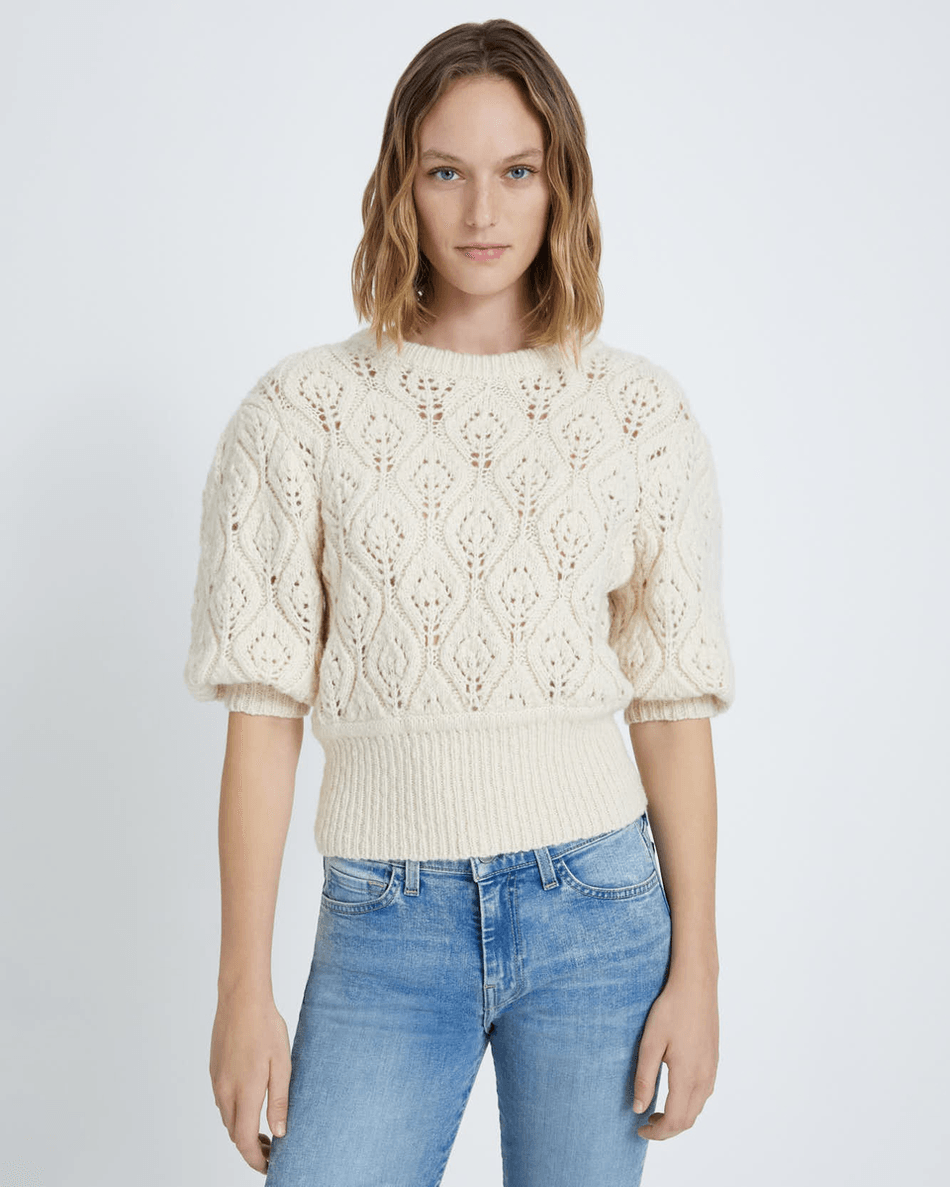 Elevate your wardrobe with the stunning 7 For All Mankind Pointelle Sweater in Cream. This chic sweater features a delicate pointelle knit that adds a touch of elegance to any outfit. With its pleat puff sleeves, this piece combines comfort and style effortlessly.