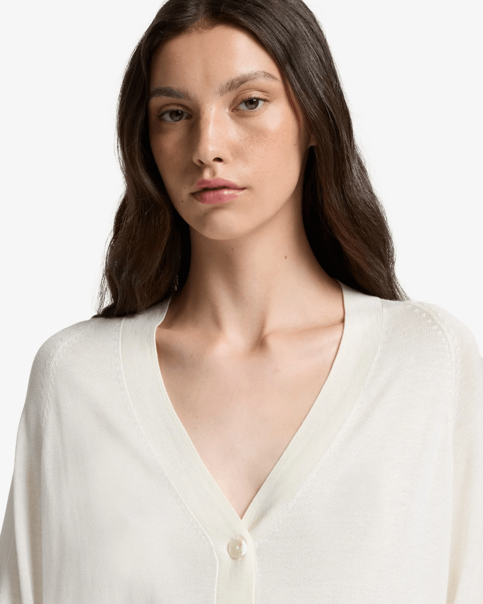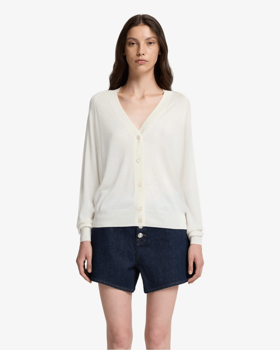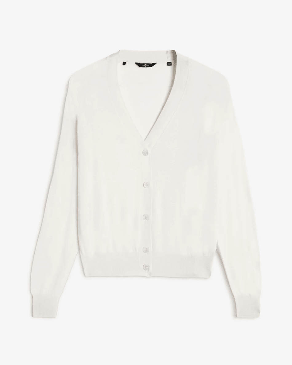 Elevate Your Wardrobe with the 7 For All Mankind Silk Blend V-Neck Cardigan in Ivory