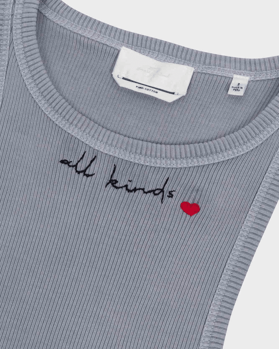 The 7 For All Mankind ALL KINDS Racerback Tank in Soft Slate features a finely ribbed texture and is beautifully embroidered with “All Kinds” and a heart at the neckline. Perfect for those sunny days, it can be worn solo with cutoff shorts or layered for a chic look. With its versatile design, this tank is a staple for any fashion-forward wardrobe.