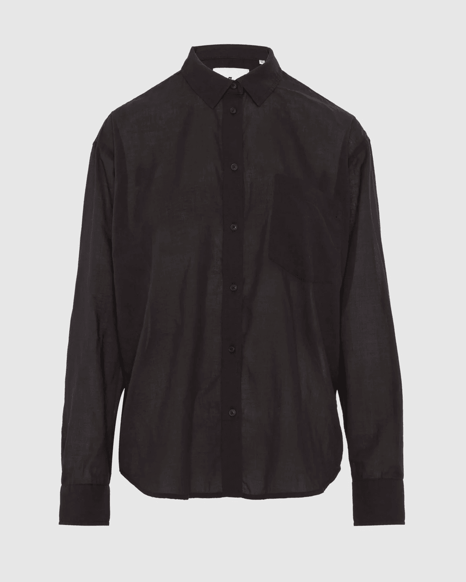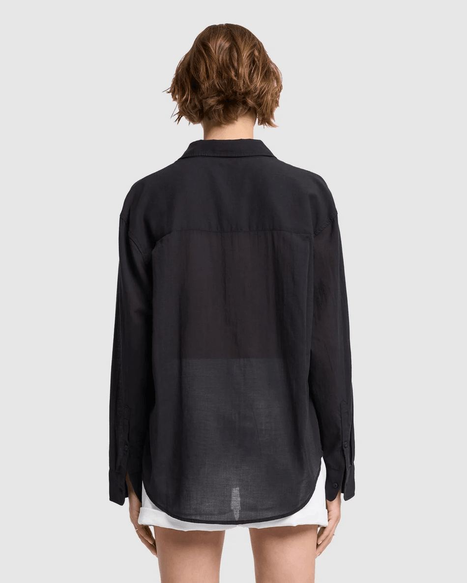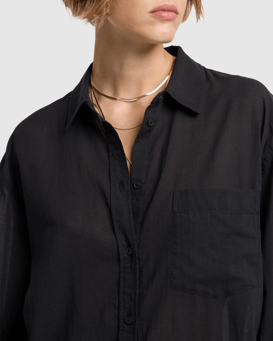 The 7 For All Mankind Classic Button Up Shirt in Black Black seamlessly blends elegance and ease. Its slightly sheer fabric gives you the freedom to layer effortlessly, whether you're heading to the office or out for a casual brunch. The relaxed fit and dropped shoulder design create an effortlessly stylish silhouette that flatters a variety of body types.